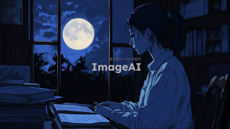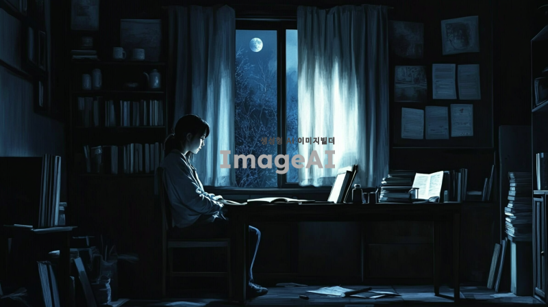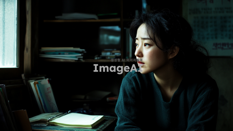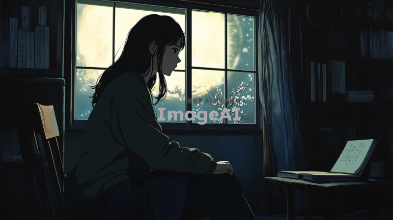 조용한 새벽 네시, 어두운 방 안에서 혼자 앉아 깊은 생각에 잠긴 한국인 여성, 창문 밖으로 희미하게 들어오는 달빛이 방 안을 은은하게 비추고 있으며, 그녀의 얼굴에는 사색에 잠긴 표정이 담겨 있다. 방 안은 아늑하고 따뜻한 분위기를 자아내며, 책과 노트가 테이블 위에 놓여 있다.