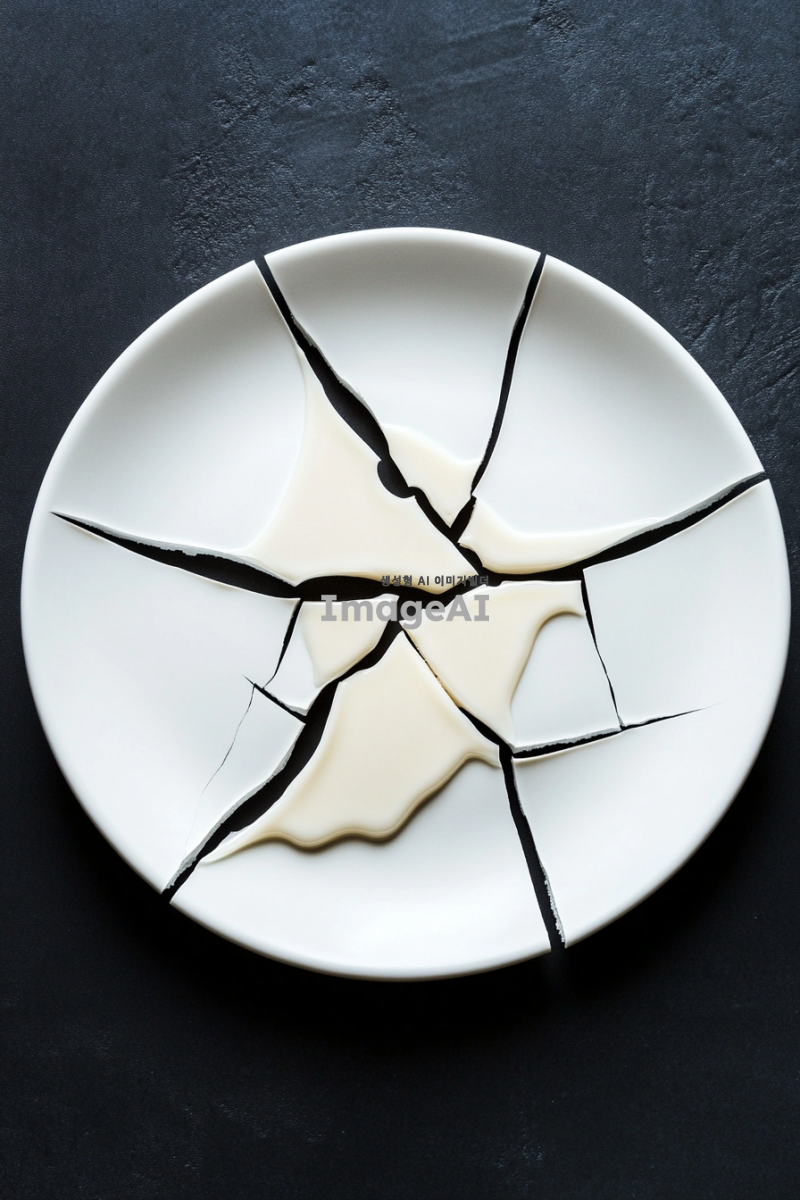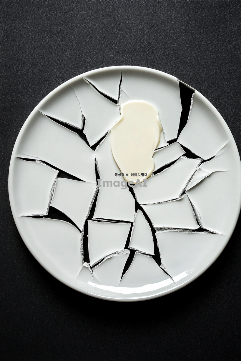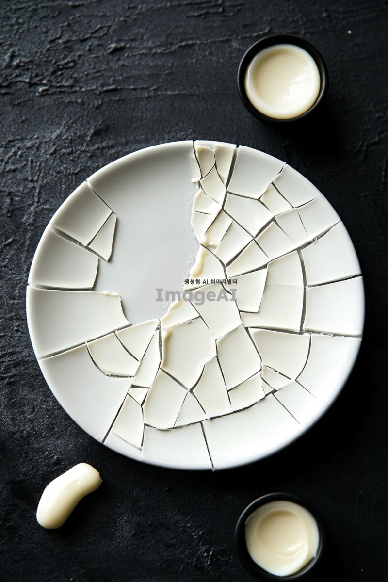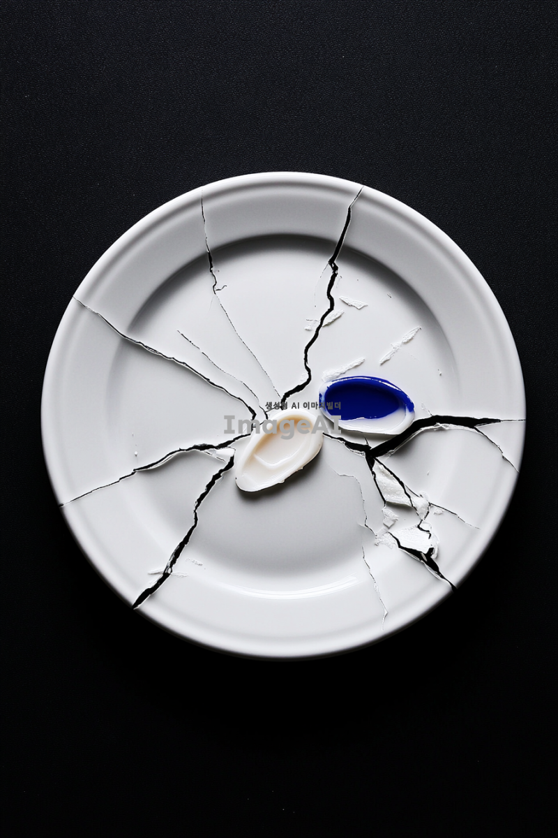 깨진 접시 위에 니베아 립밤을 반정도 발라서 그 부분은 깨진부분이 완벽하게 붙어있으며 립밤을 바르지 않은 깨진 부분의 조각들이 니베아 로고를 떠올릴 수 있게 자연스럽게 넣어줘, 접시는 흰색 배경은 검은색으로 니베아 로고가 검은색으로 보일 수 있도록해줘
