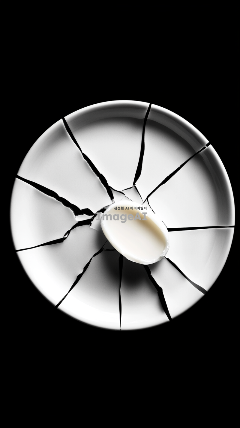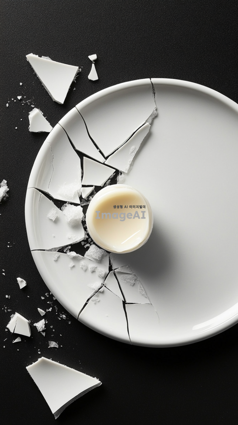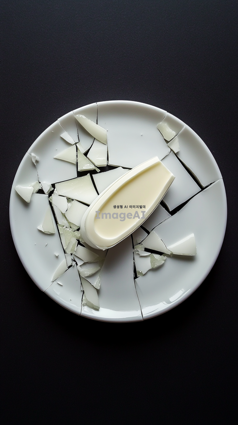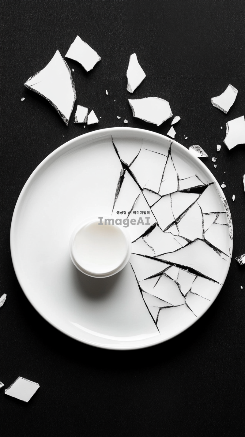 깨진 흰색 접시 위에 니베아 립밤이 반 정도 발라져 있어, 립밤이 발린 부분은 깨진 부분이 완벽하게 붙어 있는 모습. 립밤을 바르지 않은 깨진 조각들이 자연스럽게 니베아 로고를 연상시키도록 배치되어 있으며, 배경은 검은색으로 설정하여 니베아 로고가 검은색으로 보일 수 있도록 구성.
