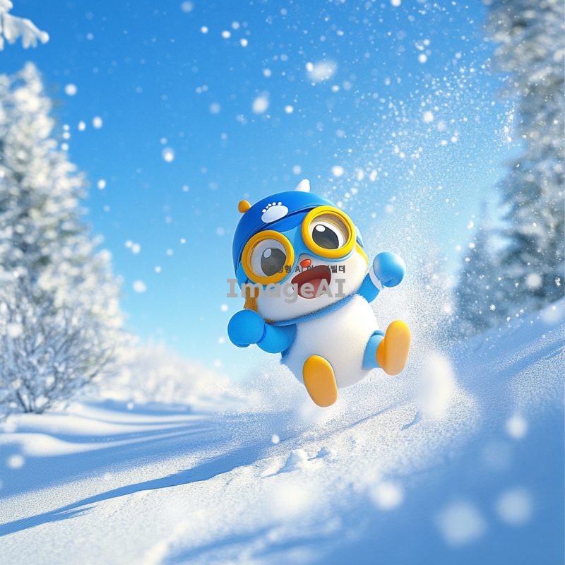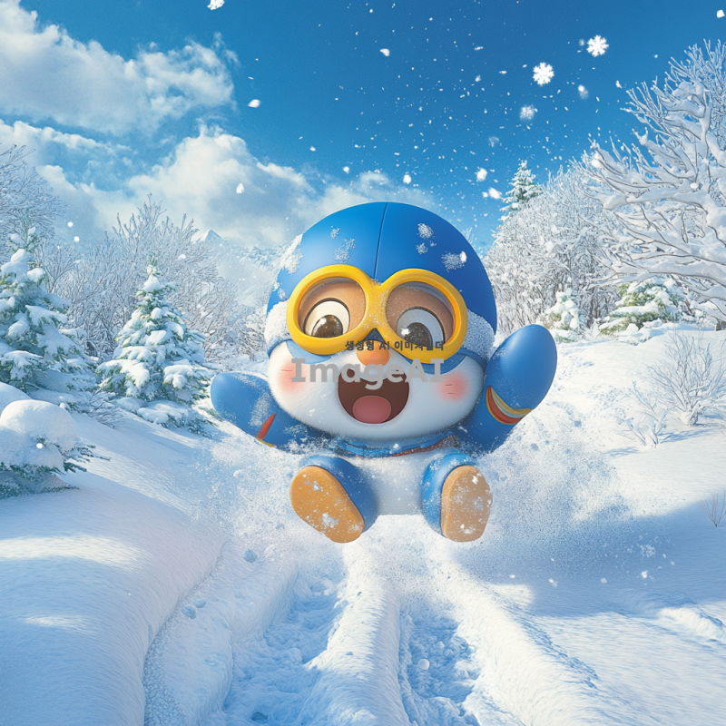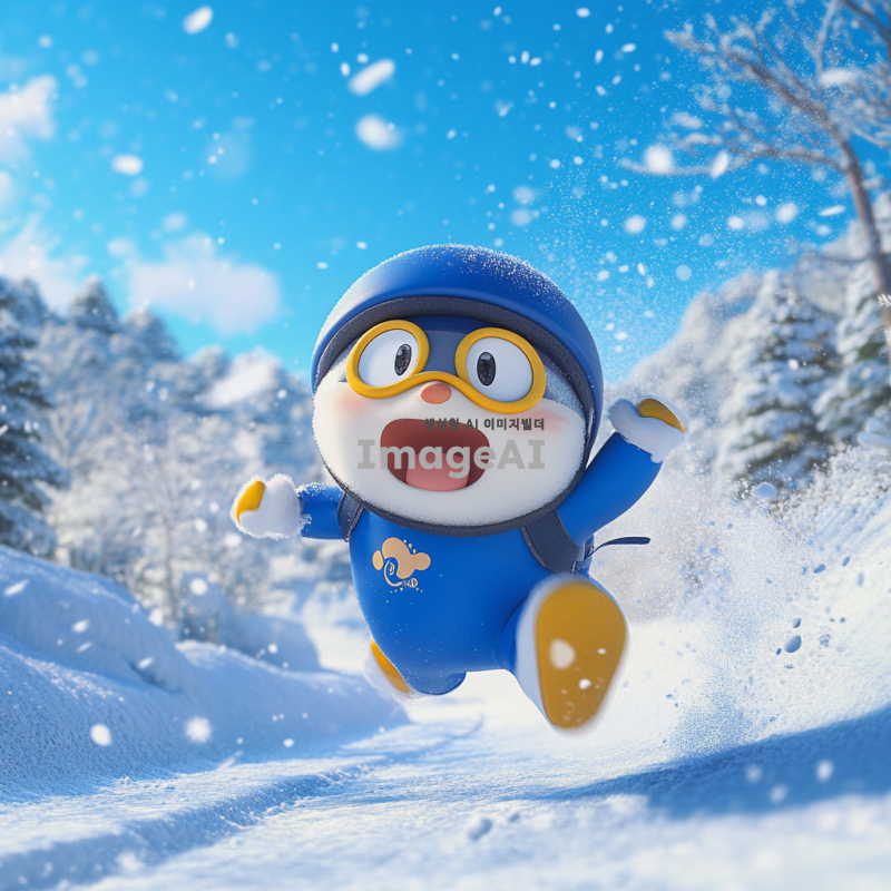 겨울철 눈 덮인 길에서 뽀로로가 신나게 뛰어가다가 넘어지는 순간을 포착한 장면, 뽀로로는 파란색 헬멧과 노란색 안경을 쓰고 있으며, 주변에는 하얀 눈이 소복이 쌓여 있고, 하늘은 맑고 푸른색이다. 뽀로로의 표정은 놀라움과 재미가 섞여 있으며, 주변에는 작은 눈송이들이 흩날리고 있다.