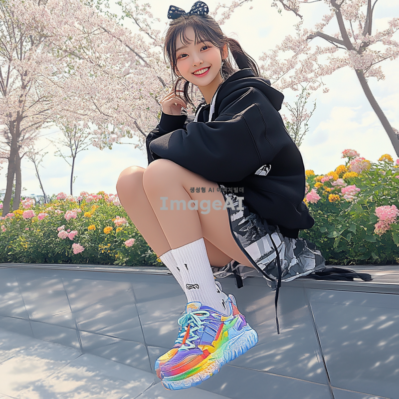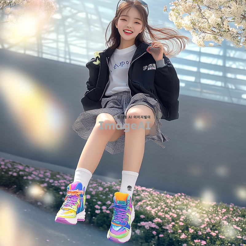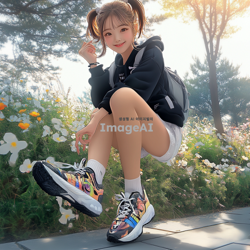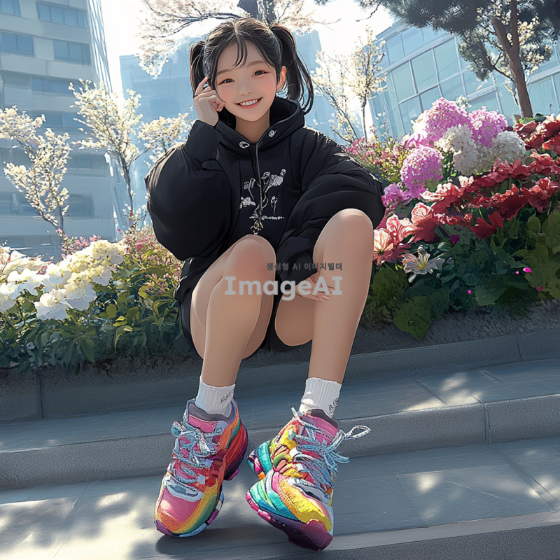 밝고 화사한 배경 속에서 귀여운 한국인 여자아이가 다채로운 색상의 운동화를 신고 있다. 아이는 활짝 웃으며 즐거운 표정을 짓고 있으며, 주변에는 꽃과 나무가 어우러진 자연 풍경이 펼쳐져 있다. 아이의 옷차림은 캐주얼하고 편안하며, 신발은 눈에 띄는 디자인으로 강조되어 있다. 자연광이 부드럽게 비치는 장면으로, 전체적으로 따뜻하고 환한 분위기이다.