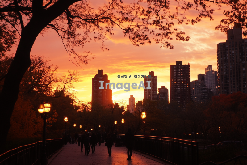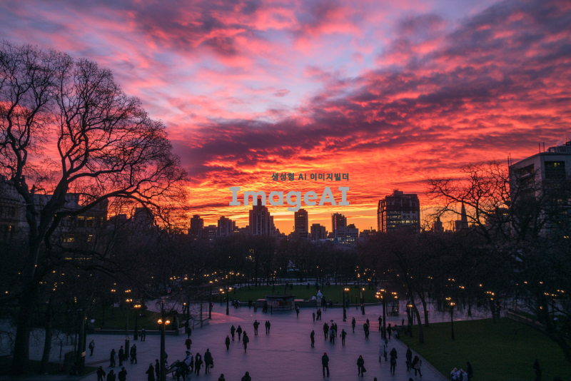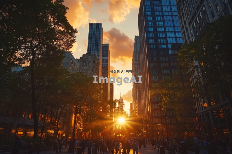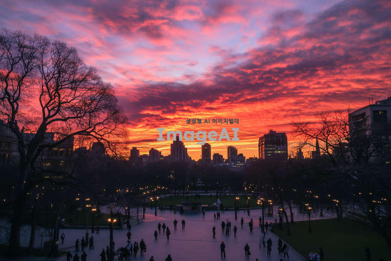 퇴근 후의 여유로운 순간을 담은 노을 타임랩스, 붉고 주황빛으로 물든 하늘과 구름, 바람에 흔들리는 나무들, 도시의 건물들이 실루엣으로 보이는 모습, 도심 속에서 바쁘게 움직이는 사람들, 점점 어두워지는 하늘과 함께 켜지는 가로등, 평화롭고 차분한 분위기, 노을이 지는 아름다운 풍경.