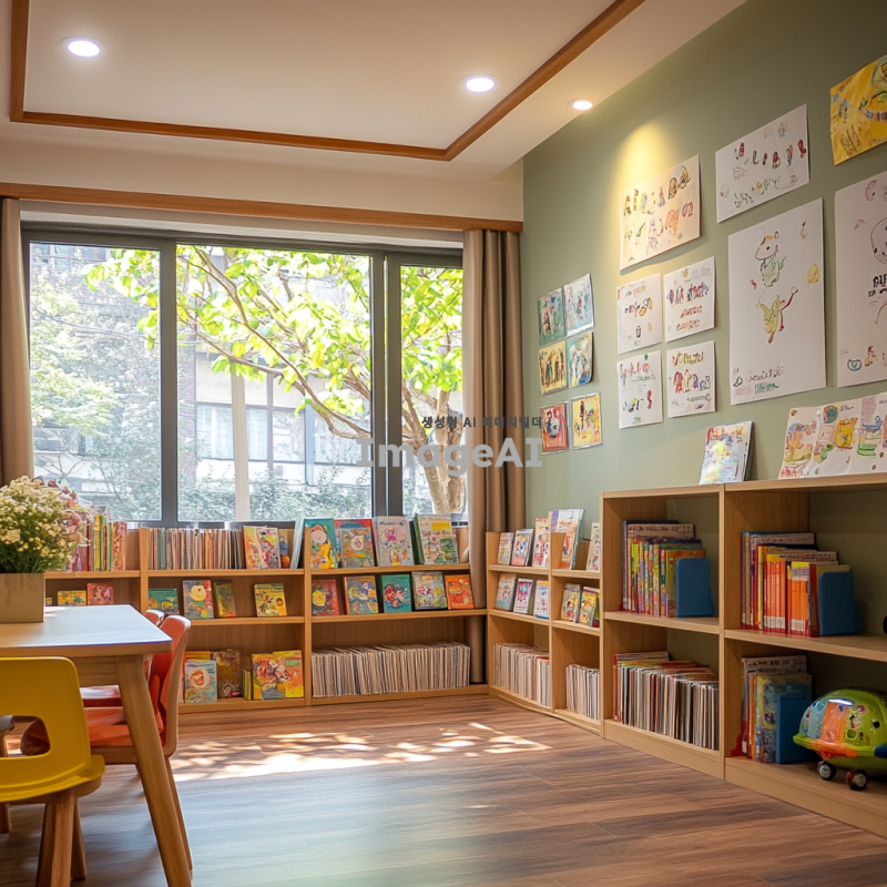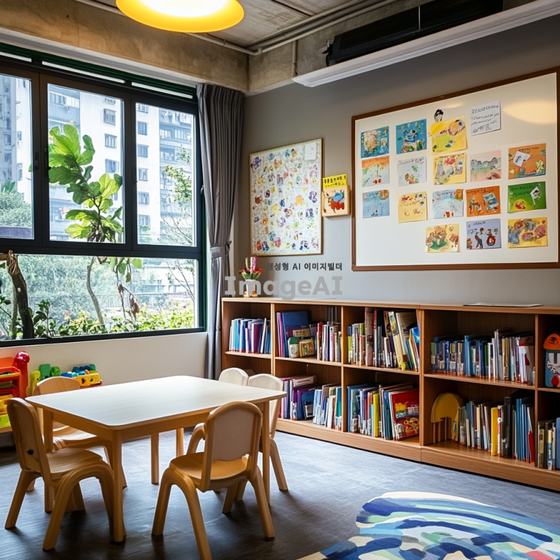 밝고 따뜻한 분위기의 가족 교육실, 노령의 부모님과 그 자녀들이 함께 모여 교육 활동에 참여하는 모습, 책과 학습 도구들이 잘 정리된 공간, 창문을 통해 자연광이 들어오는 아늑한 실내, 벽에는 교육적인 포스터와 그림들이 장식되어 있음, 따뜻함을 강조하며, 가정적인 분위기의 공간