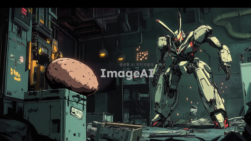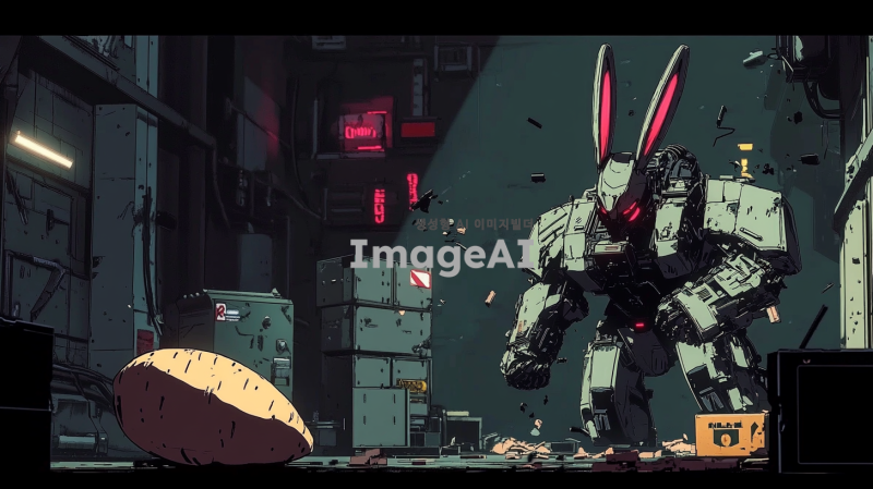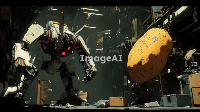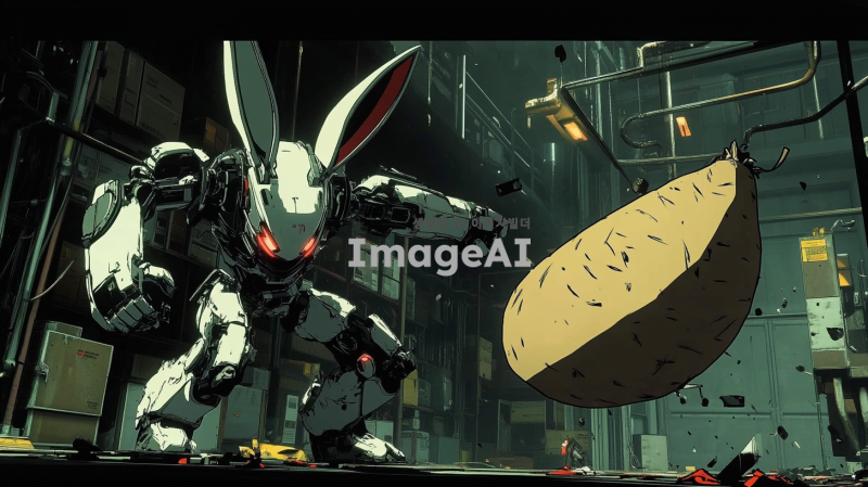어두운 조명 아래, 범죄조직의 본거지로 보이는 창고 내부. 토끼 외형의 전투형 로봇은 날렵하고 민첩한 모습으로, 금속과 기계 부품이 조화롭게 어우러진 디자인. 고구마 외형의 전투형 로봇은 단단하고 견고한 느낌으로, 표면에 전투의 흔적이 남아있음. 두 로봇은 서로를 향해 공격 자세를 취하고 있으며, 주변에는 부서진 상자와 장비들이 흩어져 있음. 긴장감 넘치는 전투의 순간을 포착한 장면.