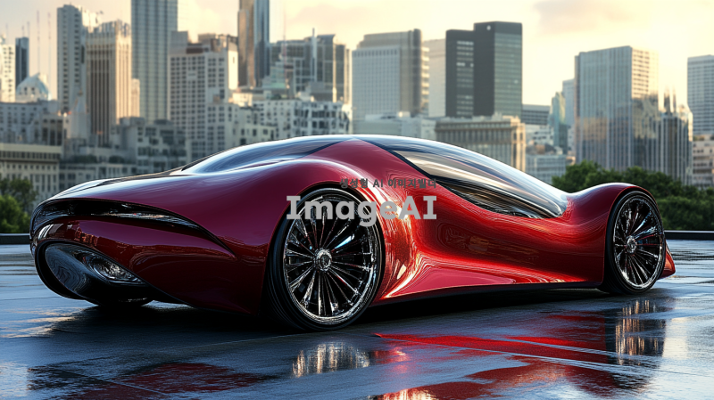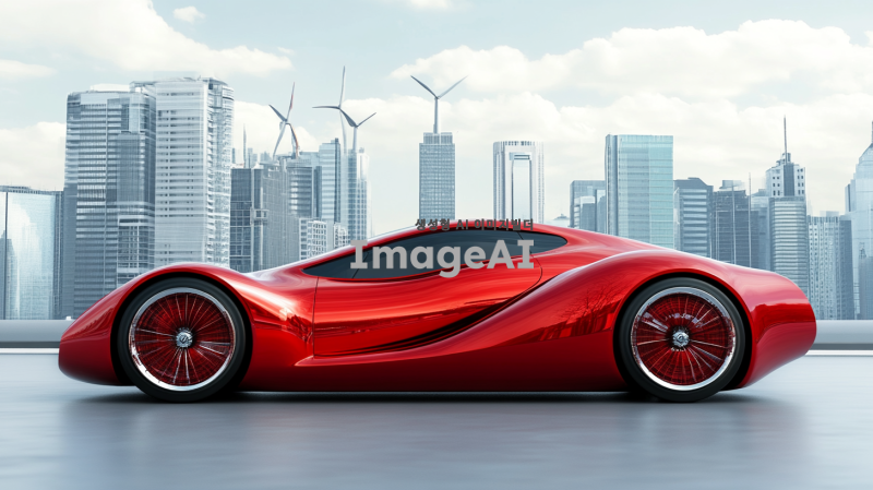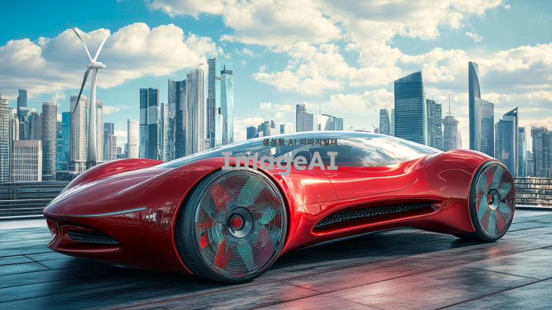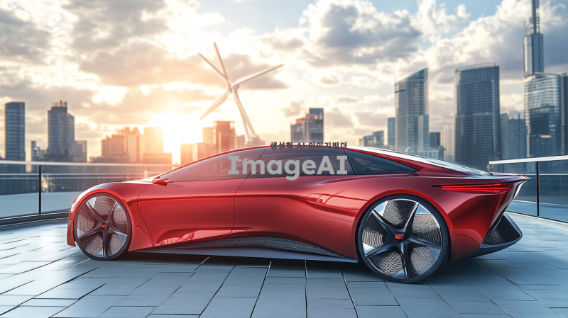 20~30대가 선호할 만한 샤프하고 날렵한 디자인의 빨간색 스포츠카, 풍력으로 작동되는 자동차, 현대적이고 미래지향적인 스타일, 공기역학적 디자인, 매끄럽고 유선형의 차체, 휠에 바람개비 모양의 독특한 요소, 첨단 기술이 돋보이는 외관, 도시 배경