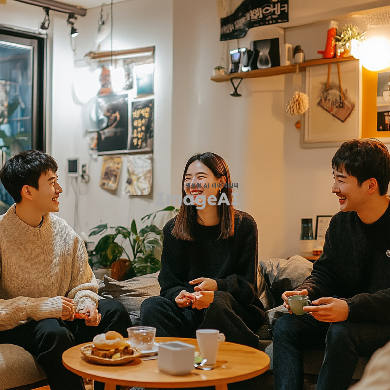 밝고 아늑한 방 안에서 외국인 두 명과 한국인 두 명이 편안하게 소파에 앉아 웃으며 대화를 나누고 있는 장면. 방은 따뜻한 조명으로 비추어져 있으며, 벽에는 다양한 문화적 요소가 담긴 장식이 걸려 있다. 테이블 위에는 커피잔과 간단한 다과가 놓여 있어 친근한 분위기를 더한다. 각 인물은 캐주얼한 복장을 하고 있으며, 서로 다른 배경을 가진 사람들이 함께 소통하는 모습이 자연스럽고 조화롭게 표현되어 있다.