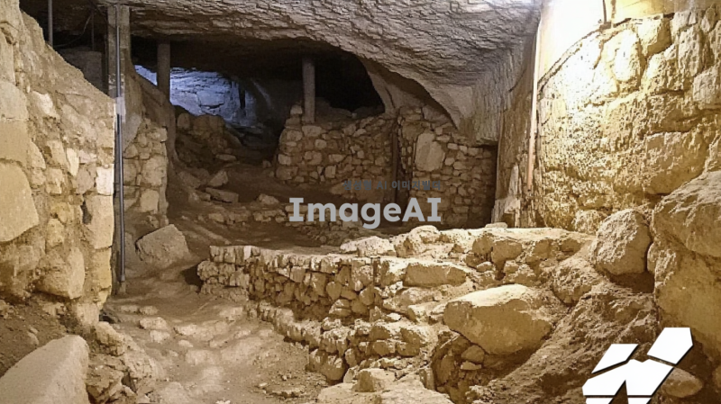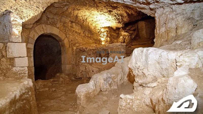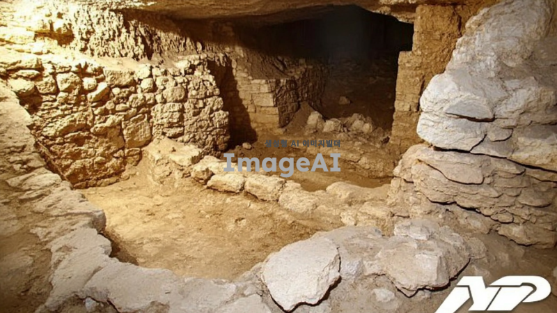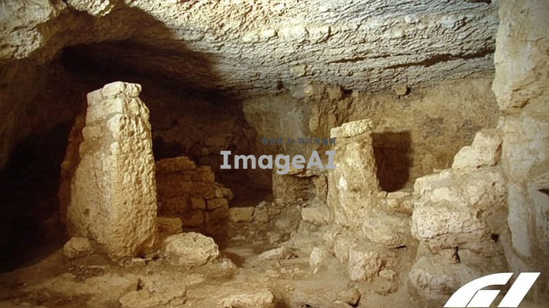 2000년전 동굴 유적의 내부. 이스라엘 팔레스타인 지역의 내부로 추정됨. 바위와 돌로 내부가 구성되어 있음.