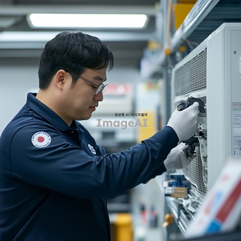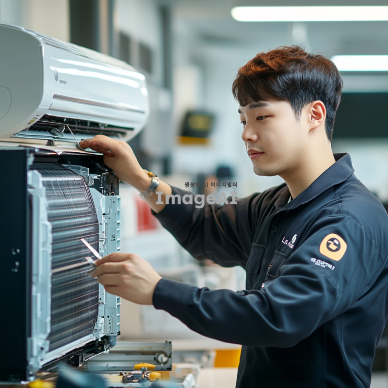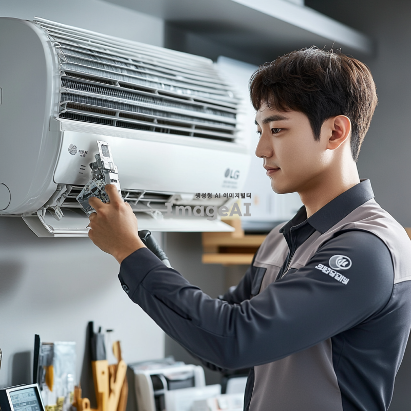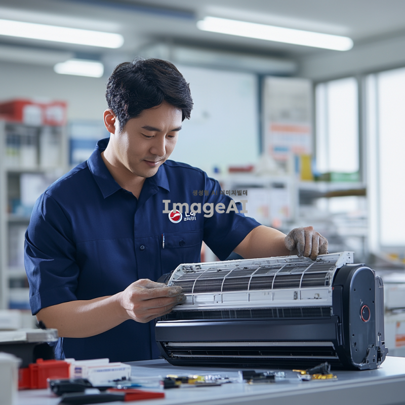 LG서비스센터 유니폼을 입은 한국인 서비스기사가 에어컨을 분해하여 청소하는 모습. 기사 주변에는 청소 도구와 에어컨 부품이 정리되어 있으며, 배경은 깔끔한 실내 환경. 서비스기사는 전문적이고 집중된 표정을 짓고 있으며, 조명이 밝고 청결한 분위기를 강조.