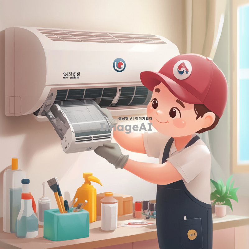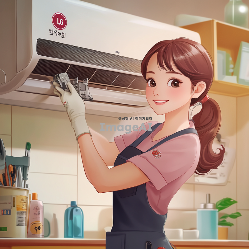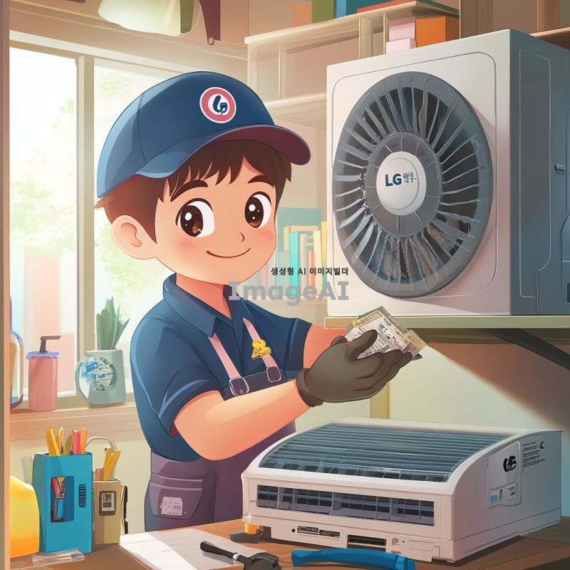 서비스센터 직원이 LG전자 로고가 있는 작업복을 입고, 에어컨을 분해하여 청소하는 장면을 묘사한 만화 스타일의 포스터. 직원은 친절하고 전문적인 표정을 짓고 있으며, 주변에는 청소 도구와 에어컨 부품들이 정리되어 있는 모습. 배경은 한국의 아파트 내부로 설정하고, 전체적으로 밝고 쾌적한 분위기를 강조.