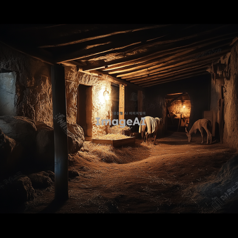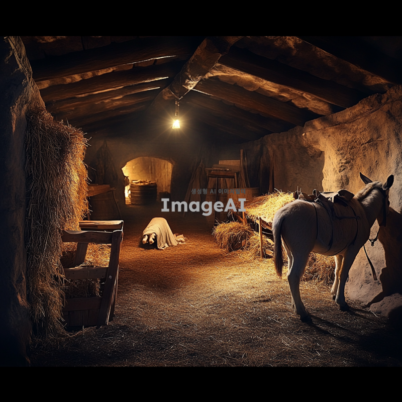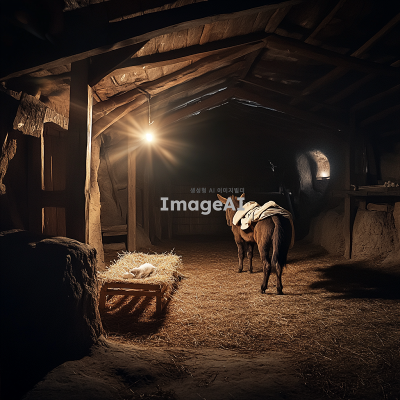 2000년전 마구간. 구유가 있음. 어두운 밤. 나귀도 함께 있음.