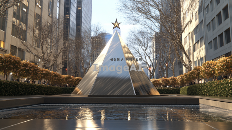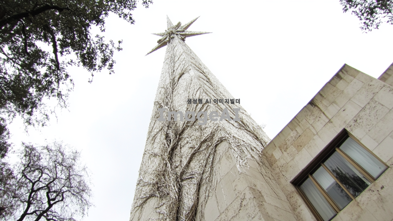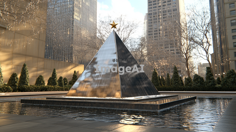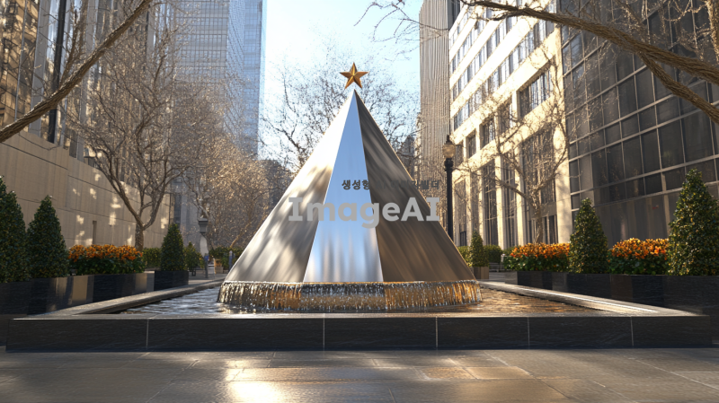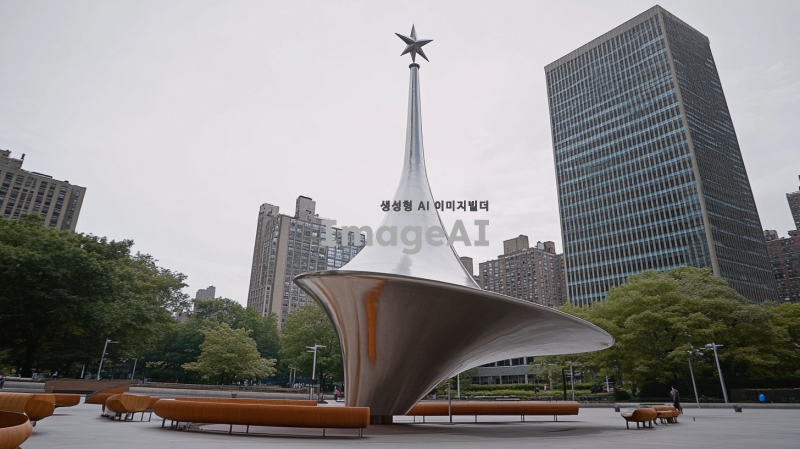 리얼리스틱한 스테인리스로 만든 원뿔 모양의 상징적인 아티팩트, 아티팩트의 꼭대기에 작은 별 모양 장식이 있는 모습, UN 건물 앞에 전시된 모습, 전체 샷, 높이 5미터