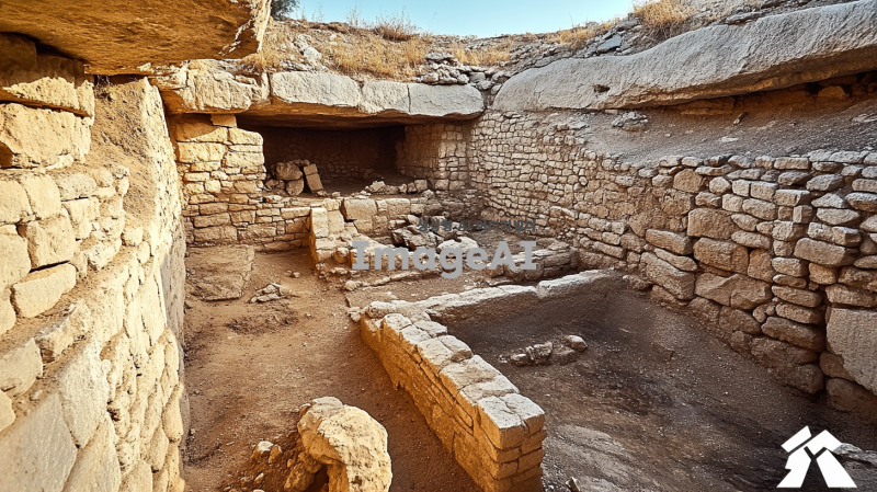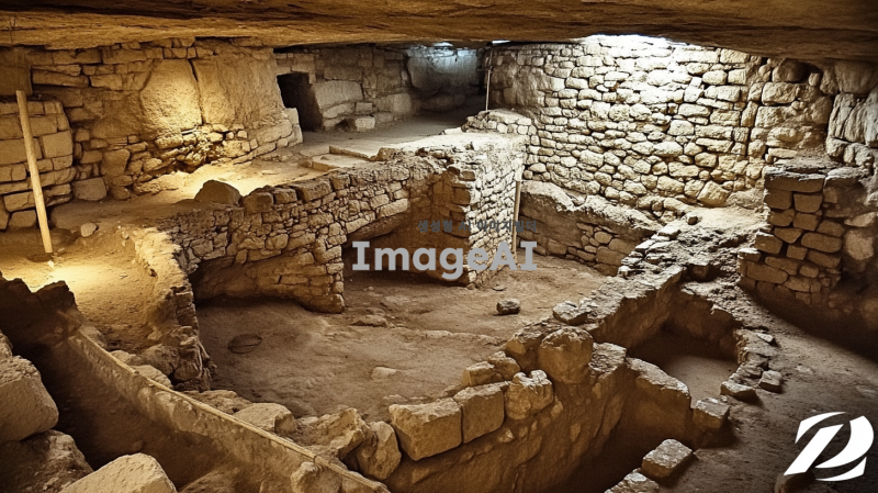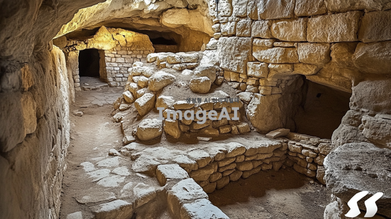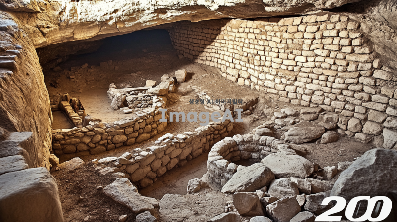 2000년전 동굴 유적의 내부. 이스라엘 팔레스타인 지역의 내부로 추정됨. 바위와 돌로 내부가 구성되어 있음. 사람은 없지만, 사람이 살았던 흔적이 있었으면 좋겠음. 사람은 없게 만들어줘.