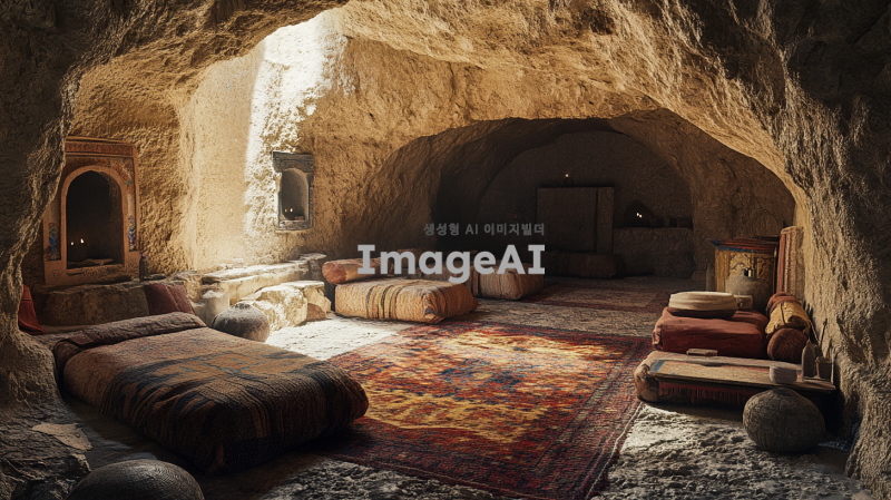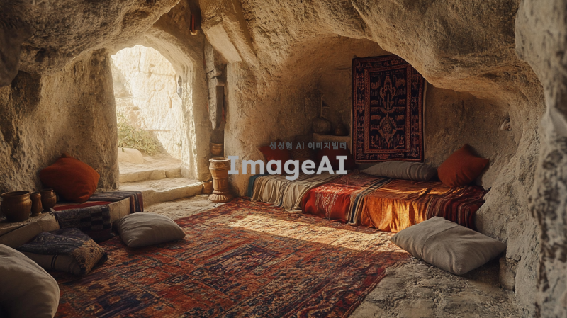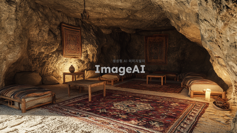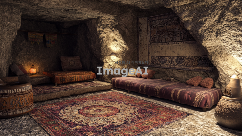 - 고대 작은 아늑한 동굴방에 간단한 가구들이 있다. 가구나 카페트는 허름한 상태다. 동굴의 벽은 좌석 공간을 만들기 위해 깎여 있다. 이 설정은 고대 중동 시대, 아마도 성경 시대의 모습을 하이퍼 리얼리즘 사진 스타일로 캡처한 것 같다.