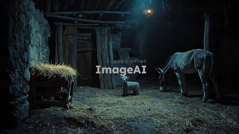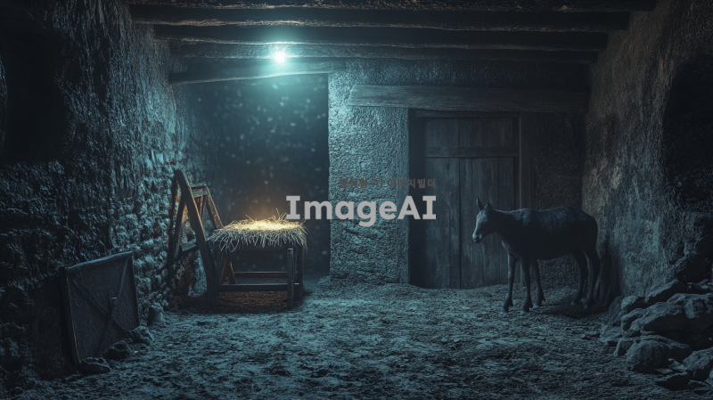 2000년전 마구간. 구유가 있음. 어두운 밤. 나귀도 함께 있음.