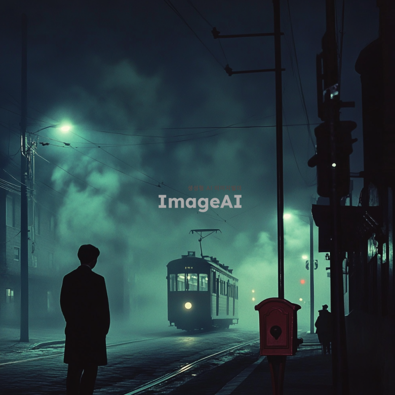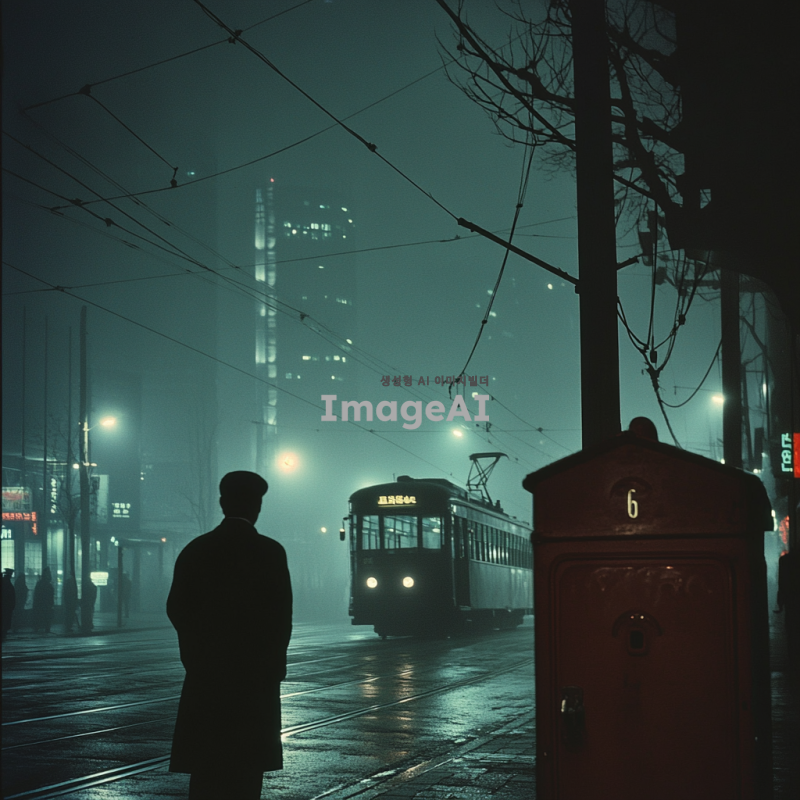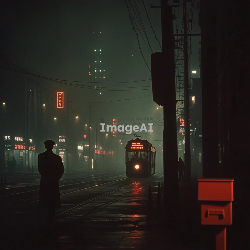 1940년 한국 서울의 도시, 깊은 밤, 짙은 안개에 뿌옇게 보이는 거리와 건물들, 원근법의 소실점처럼 먼 곳에 있는 전차, 오른쪽 하단에는 밝게 빛나는 가로등 하나와 붉은 색의 우체통 하나, 멀리 있는 전차를 바라보는 마른 남자의 뒷모습 전신, 애니메이션 느낌,