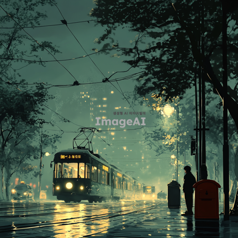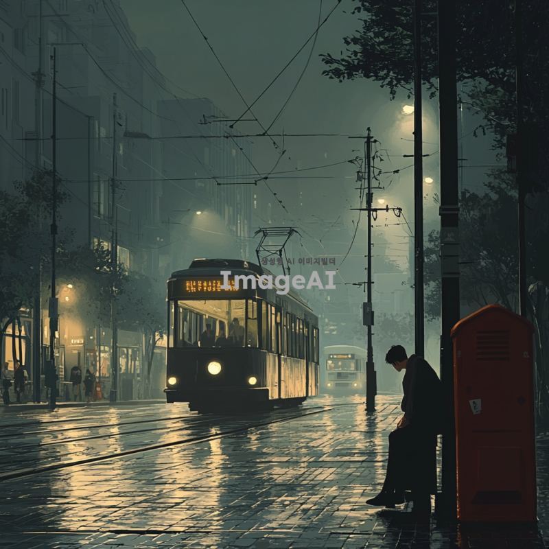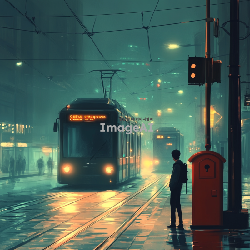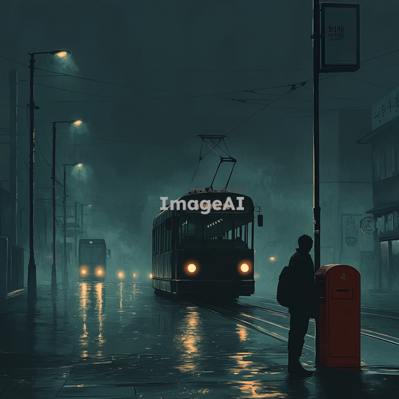 안개 낀 깊은 밤, 물이 흐르듯 전차와 차량 몇 대가 달려가는 속도감을 표현한 거리, 오른쪽 하단에 붉은 우체통에 기대어 멀리 떠나는 전차를 바라보는 한국인 남성, 애니메이션 스타일, 부드러운 색감과 선명한 디테일, 몽환적이고 신비로운 분위기.