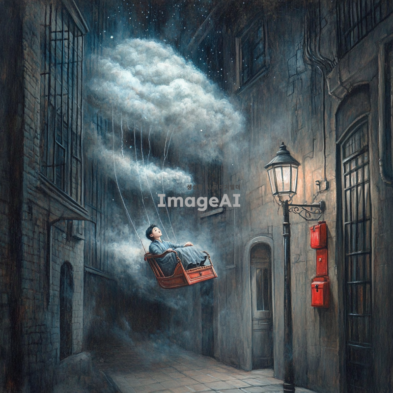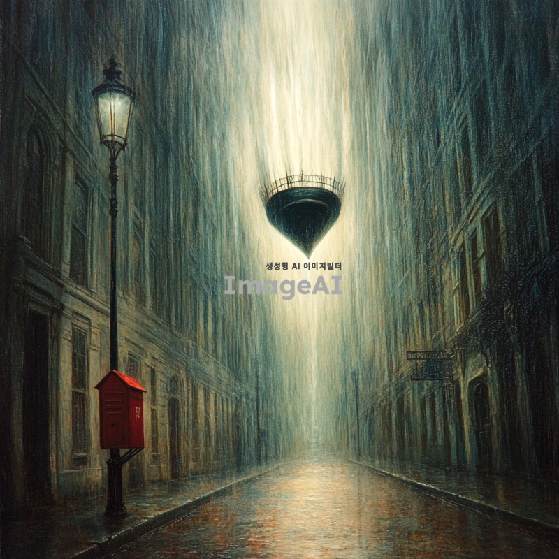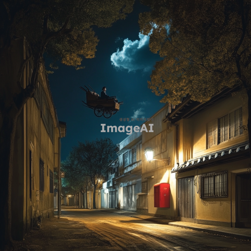 깊은 밤, 어둡고 신비로운 하늘을 배경으로 공중에 떠서 날아가는 전차, 거리의 구석에는 따뜻한 빛을 발하는 가로등 하나와 붉은 우체통이 놓여있다. 하늘을 날아가는 전차를 바라보는 한국인 남성, 비현실적이고 몽환적인 분위기의 장면.