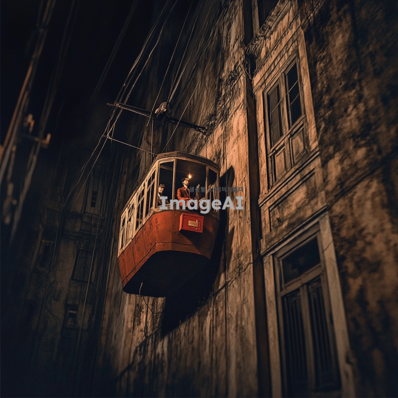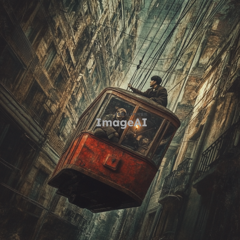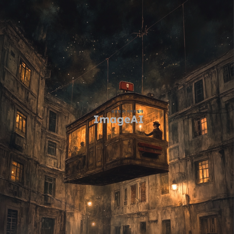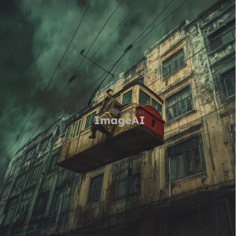 1930년대 한국 도시의 거리, 낡은 건물들, 별이 없는 어두운 밤, 공중에 떠서 날아가는 1930년대식 전차, 전차 안에 있는 한국인들, 한쪽 구석에 붉은 우체통, 촛불을 들고 붉은 우체통 위에 앉아 있는 사내, 비현실적인 장면, 어두운 색감과 신비로운 분위기.