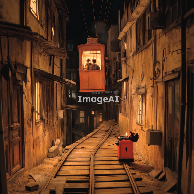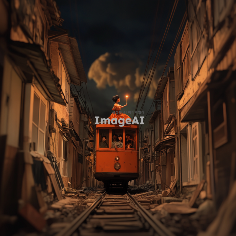 1930년대 한국 도시의 거리, 허름한 가게와 집, 2~3층짜리 낡은 건물들이 늘어선 컴컴한 밤, 하늘 높은 곳에 떠 있는 1930년대식 전차, 전차 안에 있는 한국인들, 땅에는 붉은 우체통, 손에 촛불을 들고 붉은 우체통 위에 앉아 있는 한 명의 한국 남성, 비사실적이고 초현실적인 장면.