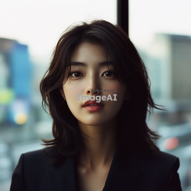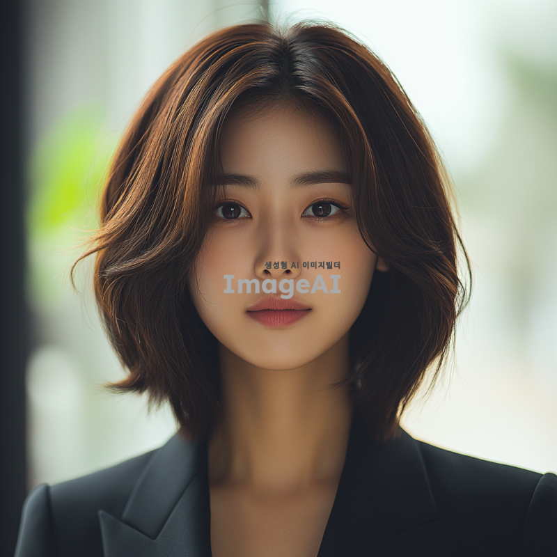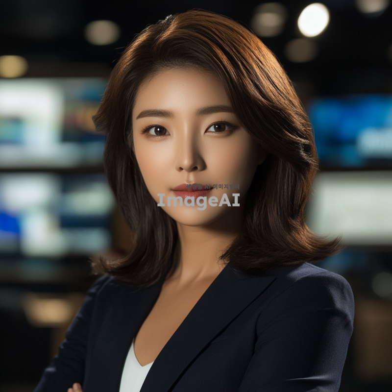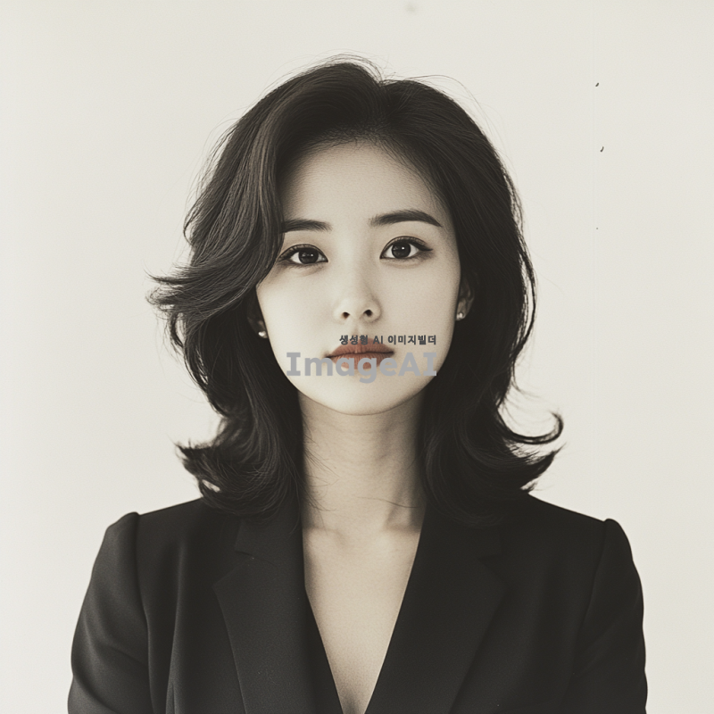 30대 초반의 한국인 젊은 여성 전문가, 머리는 볼륨감이 없는 중단발 머리로 떨어지고, 아나운서같은 도시적인 이미지로, 차분하고 세련된 분위기의 정면을 주시하고있는 증명사진