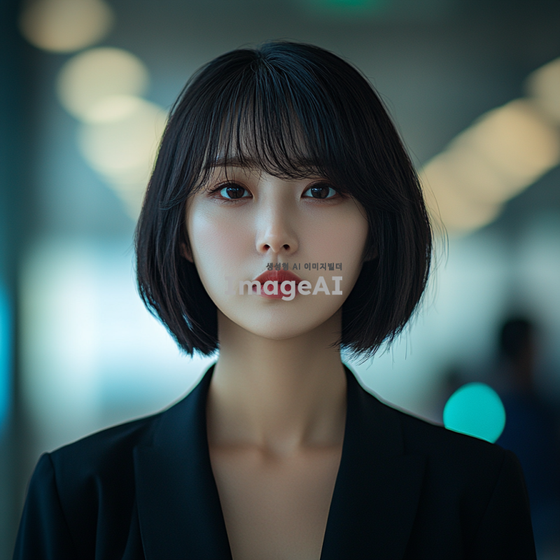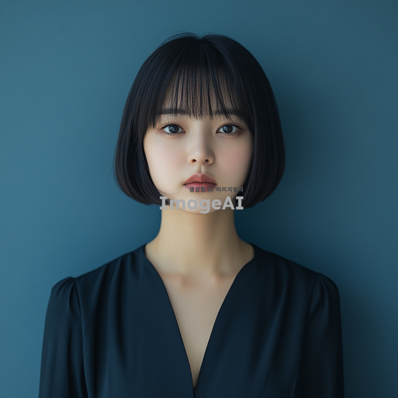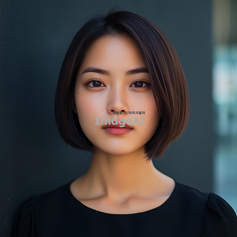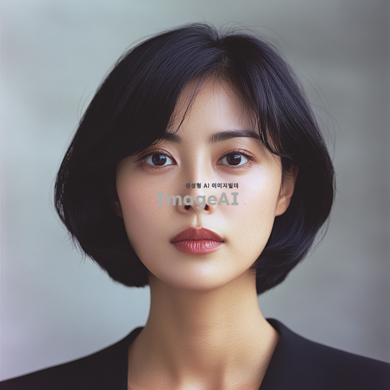 30대 초반의 한국인 젊은 여성 전문가, 짧은 볼륨감없는 칼단발머리, 아나운서같은 도시적인 이미지로, 차분하고 세련된 분위기의 정면을 주시한 증명사진