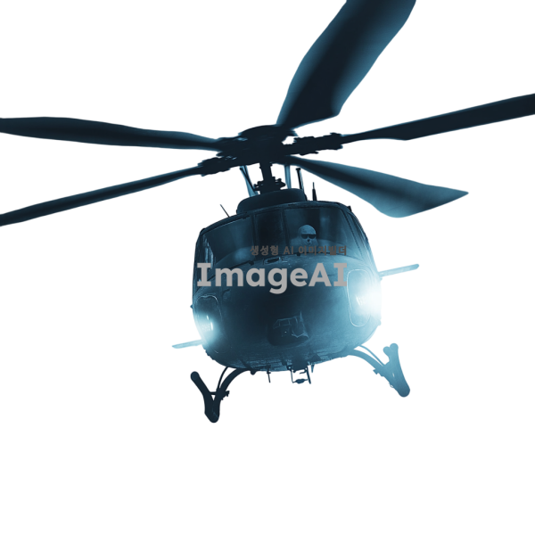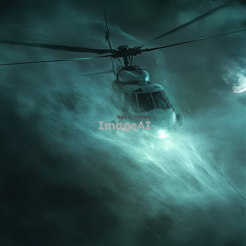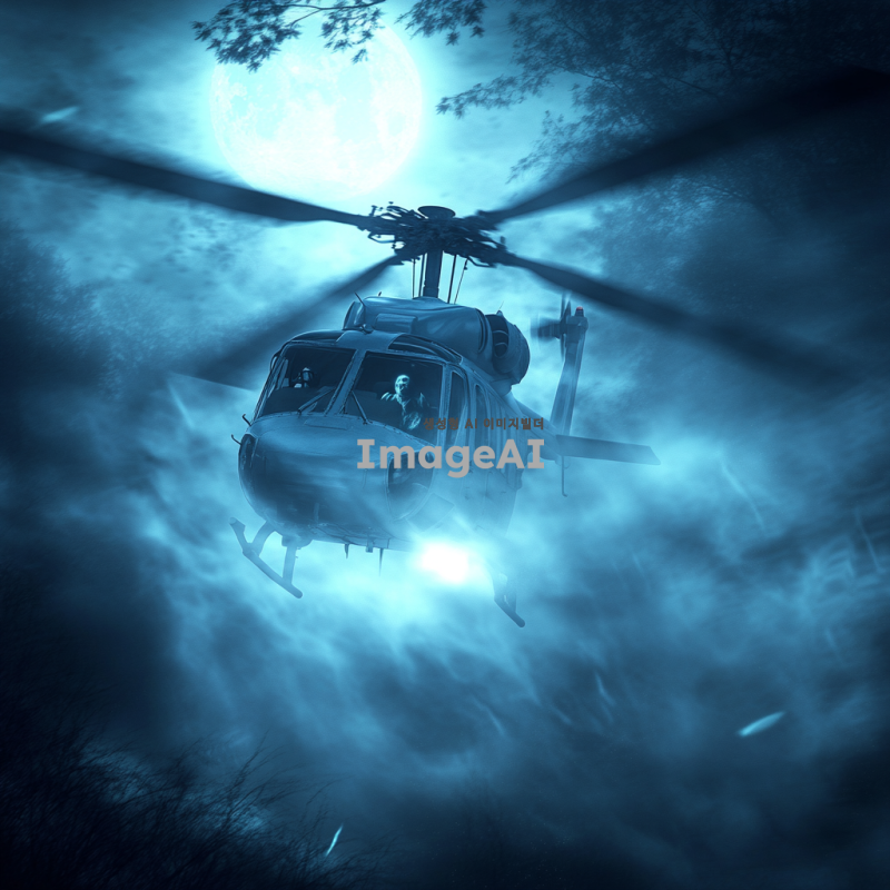 어두운 하늘을 배경으로 한 으스스한 분위기의 헬리콥터, 헬리콥터는 반투명한 유령 같은 형상으로, 희미하게 빛나는 불빛이 주변을 감싸고 있음. 헬리콥터의 프로펠러는 천천히 회전하며, 바람에 흔들리는 안개가 주변을 감도는 모습. 헬리콥터의 창문 너머로 희미하게 보이는 유령 같은 형상의 조종사, 조종사는 흐릿하고 신비로운 느낌으로 표현. 배경은 고요한 밤의 숲, 달빛이 나뭇잎 사이로 비춰 신비로운 분위기를 더함.
