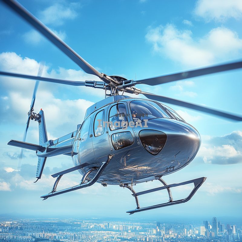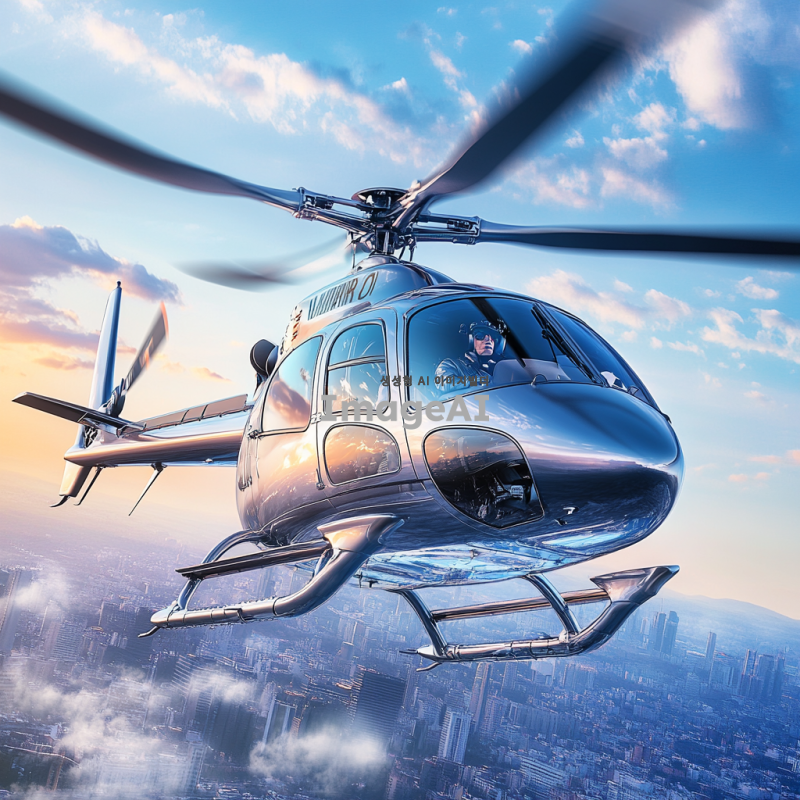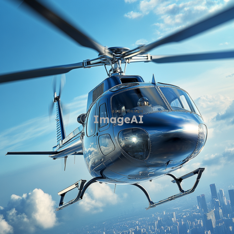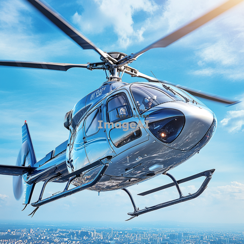 푸른 하늘을 배경으로 날아오르는 현대적인 디자인의 헬리콥터. 헬리콥터는 은색과 파란색의 조화를 이루고 있으며, 태양빛을 반사하여 반짝이는 모습. 헬리콥터의 프로펠러가 빠르게 회전하고 있고, 주변에는 구름이 흩어져 있어 하늘의 깊이를 더해줌. 헬리콥터의 창문을 통해 내부의 조종석이 희미하게 보이며, 조종사는 헬멧을 착용하고 비행에 집중하고 있는 모습. 멀리 보이는 도시의 스카이라인이 배경을 이루며, 헬리콥터가 도시 위를 비행하는 역동적인 장면.