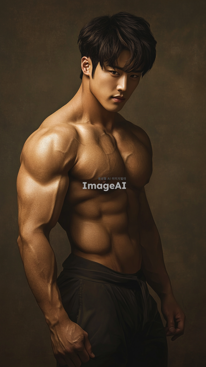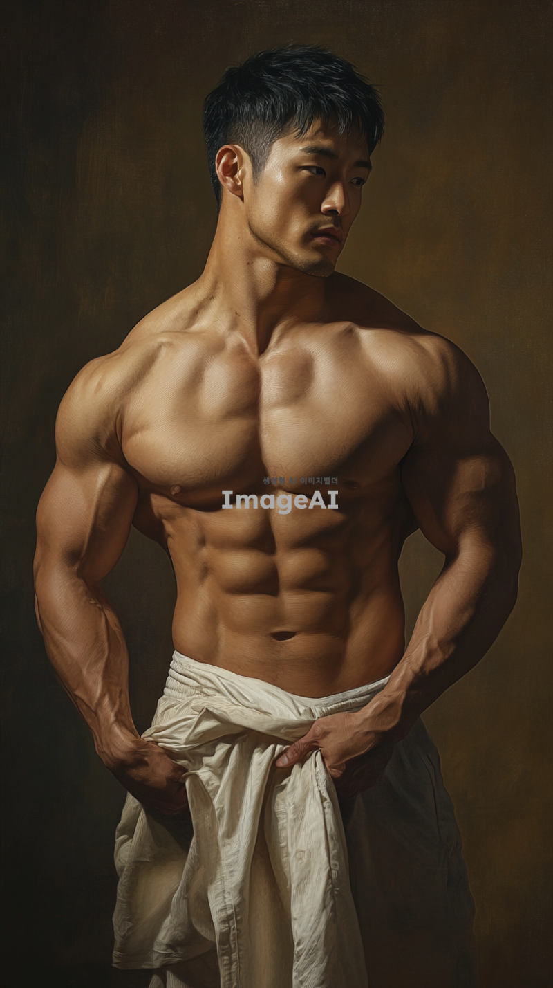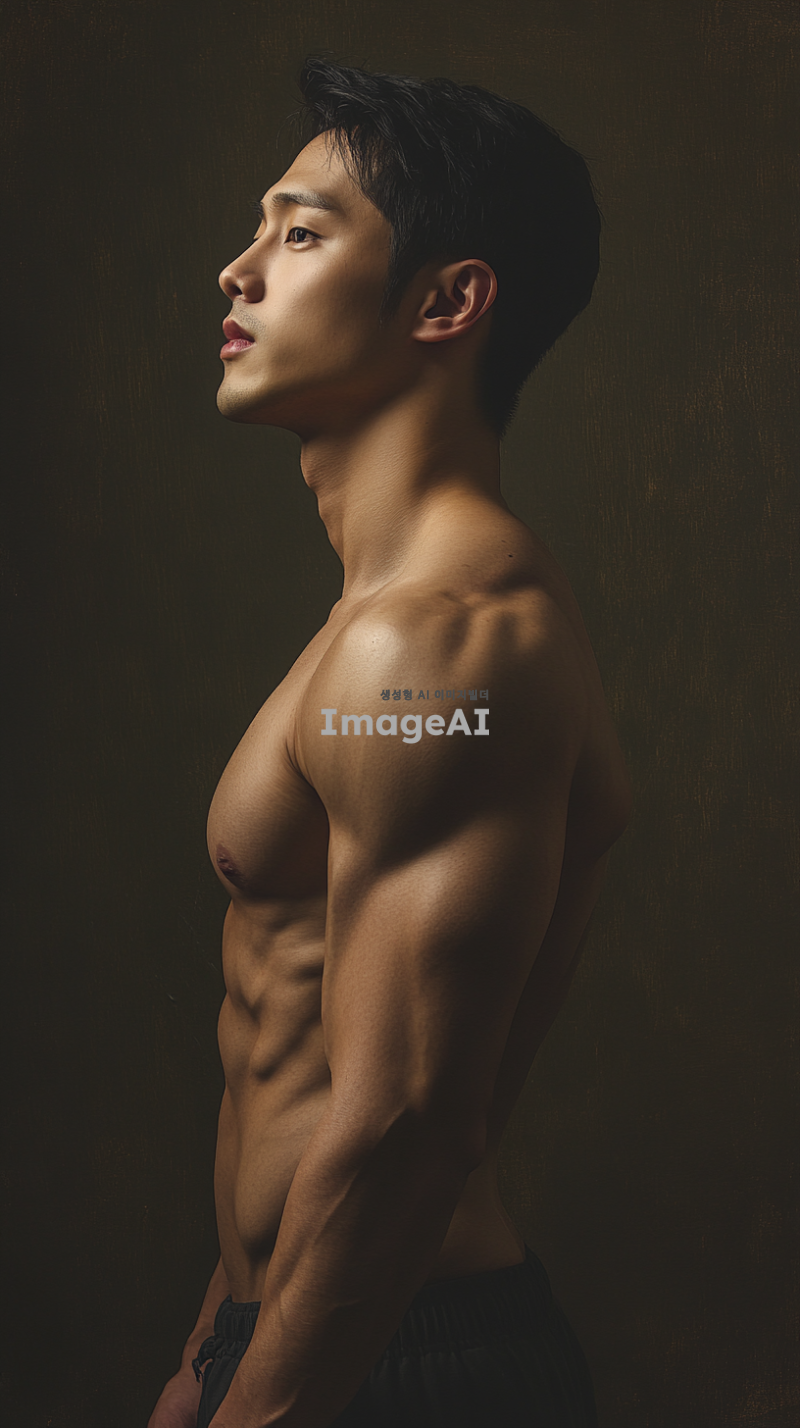30대 한국 남성, 근육질의 체격, 자연스러운 포즈, 부드러운 조명, 예술적이고 고전적인 스타일, 배경은 중립적인 색상, 세부적인 해부학적 디테일, 섬세한 피부 질감, 조화로운 구도.