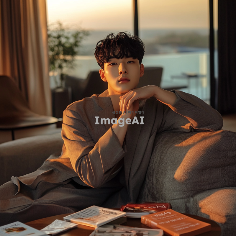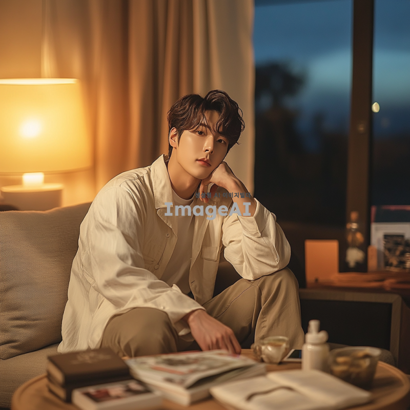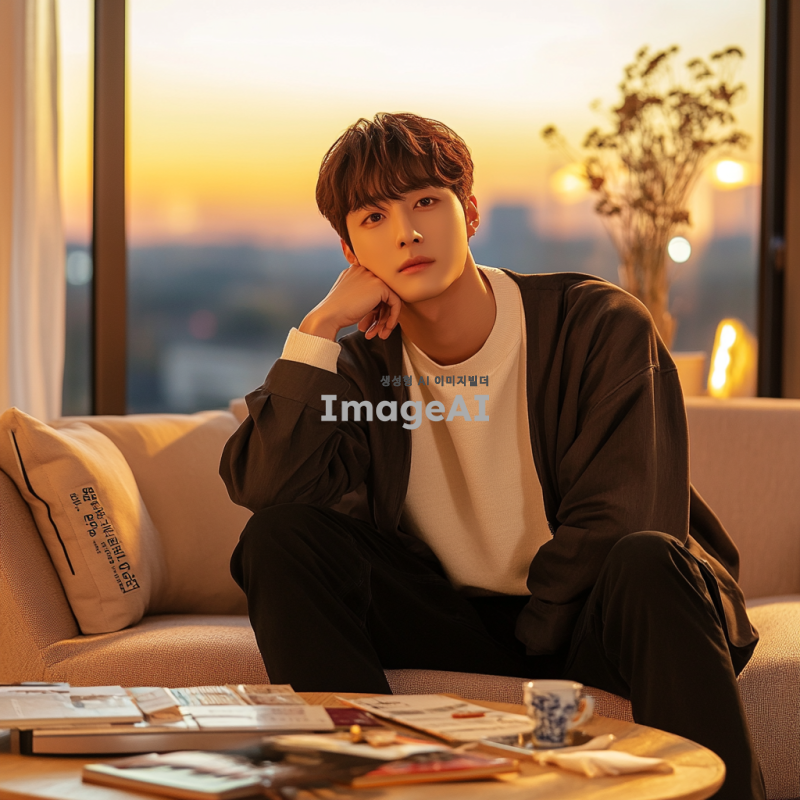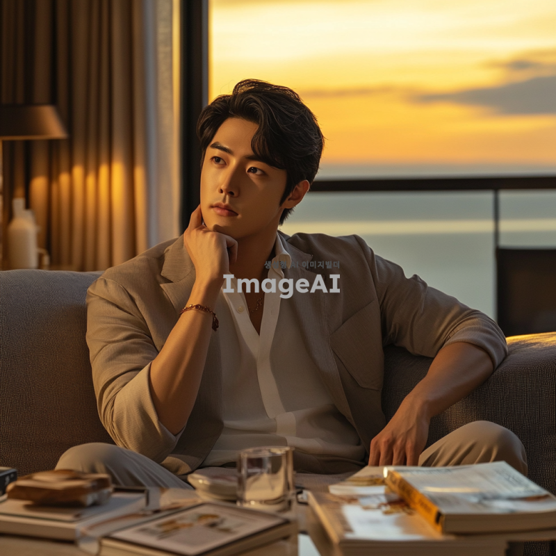 잘생긴 한국 남성 모델이 현대적인 디자인의 소파에 앉아 있는 장면. 모델은 세련된 캐주얼 복장을 입고 있으며, 손으로 턱을 괴고 생각에 잠긴 표정을 짓고 있다. 주변에는 조명이 은은하게 비치는 아늑한 거실 환경이 조성되어 있고, 커피 테이블 위에는 다양한 요리책과 메뉴가 펼쳐져 있다. 창문 밖으로는 저녁 노을이 보이며, 방 안은 따뜻한 색감으로 가득 차 있다.