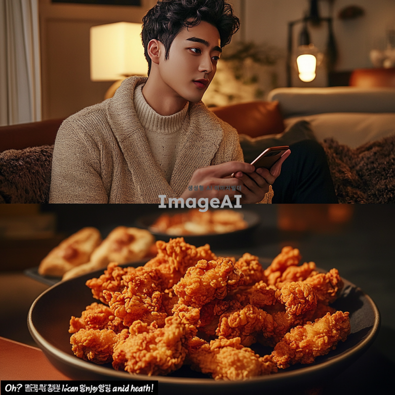 3. 한국의 잘생긴 남성 모델이 스마트폰을 들고 치킨을 주문하려다 건강을 생각하며 망설이는 모습, 진지한 표정, 건강을 고려하는 듯한 분위기.
