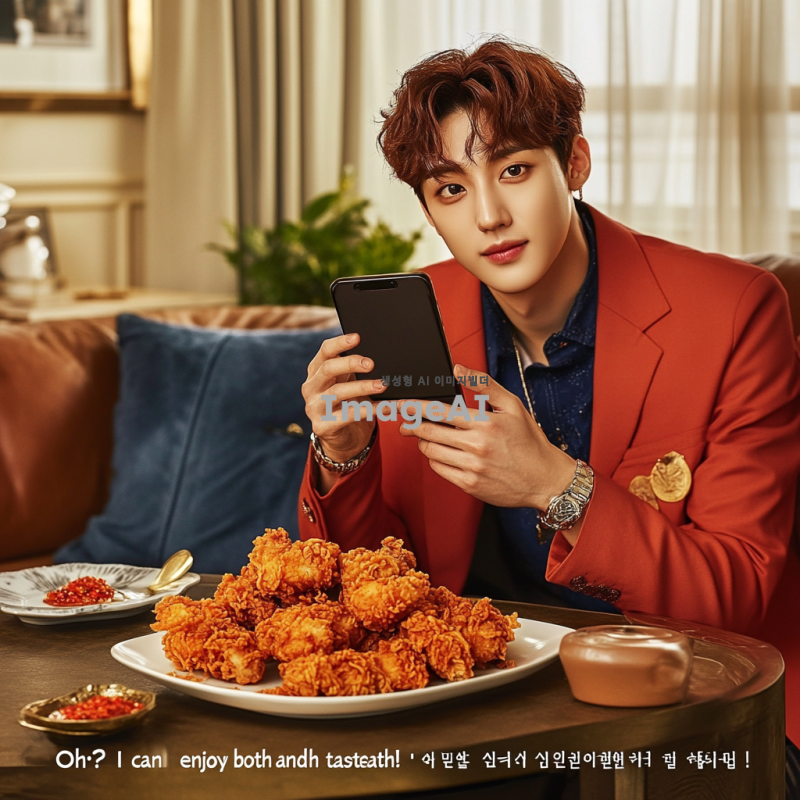 2. 한국의 잘생긴 남성 모델이 스마트폰을 들고 치킨을 주문하려는 상황, 기대감에 찬 얼굴, 편안한 집안 분위기.