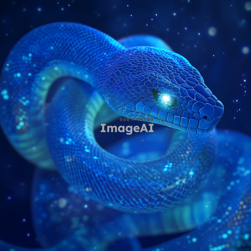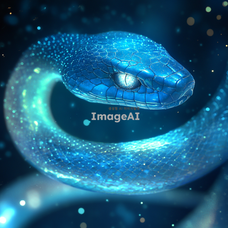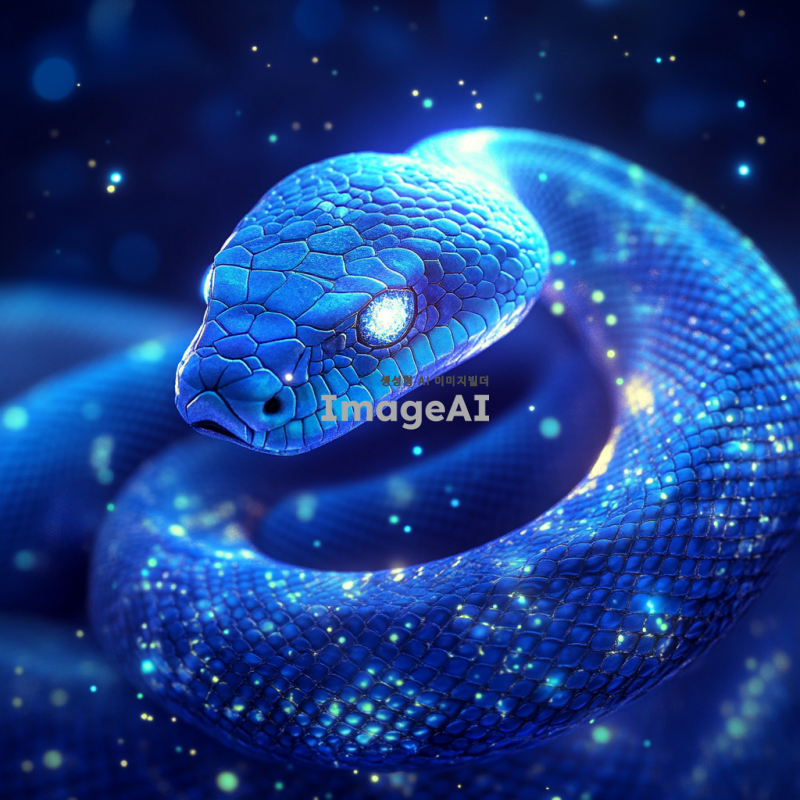푸른 배경 위에 신비롭게 빛나는 푸른뱀, 뱀의 비늘은 빛을 반사하며 다양한 파란색과 녹색의 오묘한 색조를 띄고 있음, 뱀의 눈은 밝고 매혹적인 빛을 발하며 지혜로운 느낌을 줌, 뱀의 몸은 부드럽게 곡선을 그리며 우아하게 움직이고 있음, 주변에는 작은 별빛들이 반짝이며 환상적인 분위기를 더함, 전체적으로 몽환적이고 신비로운 분위기, 고화질, 세밀한 디테일.