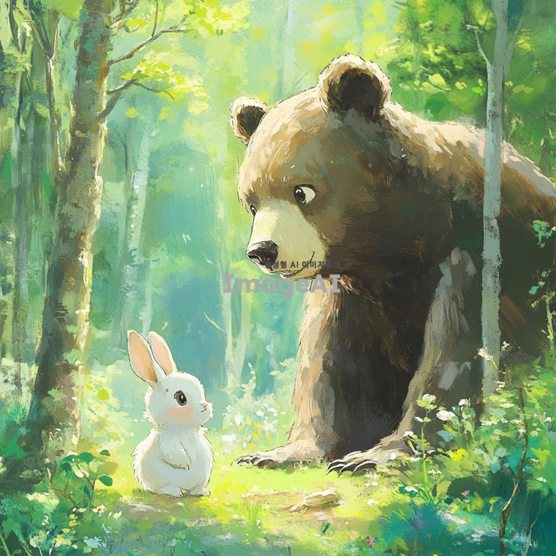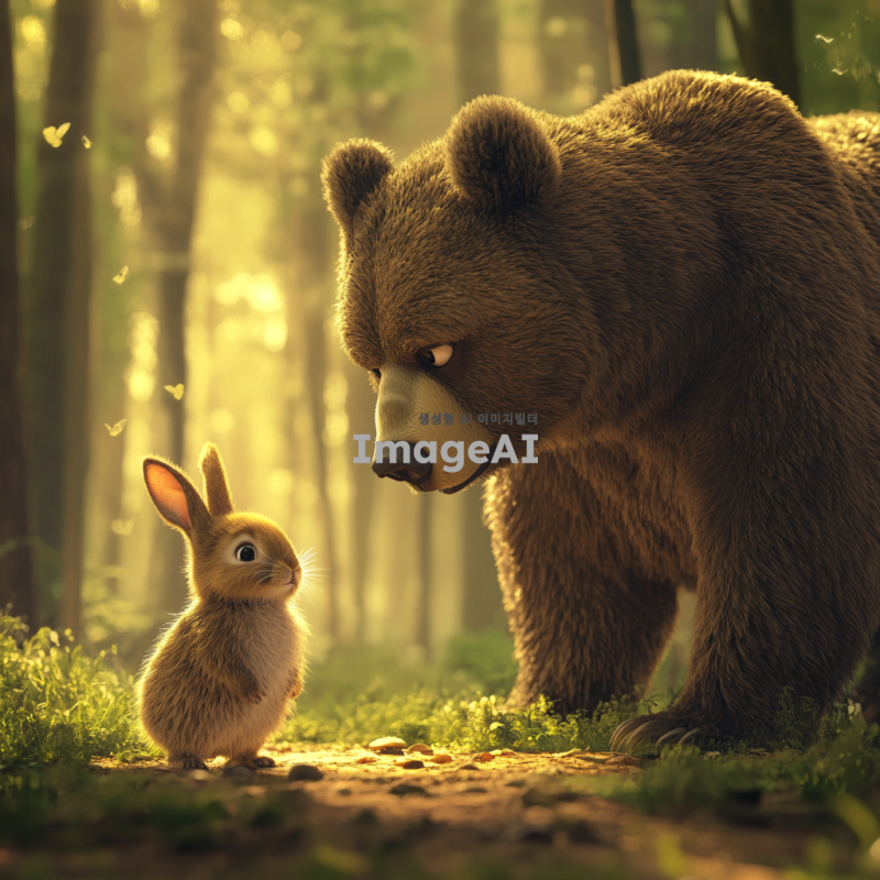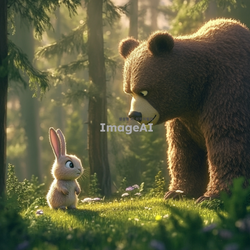 숲속의 평화로운 정경 속에서 작은 토끼가 커다란 곰을 똑바로 바라보고 있는 장면. 토끼는 귀엽고 약간 화난 표정을 짓고 있으며, 곰은 놀란 듯한 표정으로 토끼를 내려다보고 있다. 배경은 푸른 나무와 부드러운 햇살이 비치는 초원으로 둘러싸여 있다. 토끼와 곰의 크기 차이가 강조되어 있으며, 전체적인 분위기는 유머러스하다.
