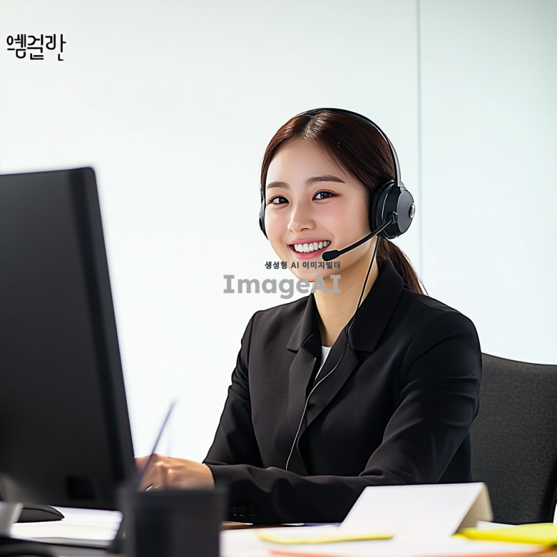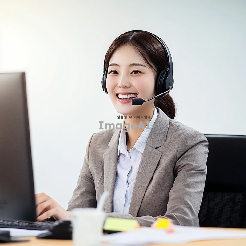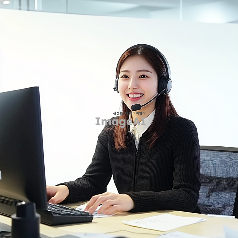 고객센터에서 일하는 한국 여성을 묘사하는 이미지. 그녀는 밝고 친절한 미소를 지으며 헤드셋을 착용하고 있다. 사무실 환경에서 컴퓨터 앞에 앉아 있으며, 깔끔하고 단정한 복장을 하고 있다. 주변에는 고객 응대를 위한 메모와 전화기가 놓여 있다. 그녀의 표정은 전문적이고 신뢰감을 준다.