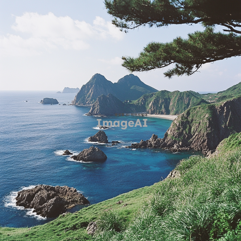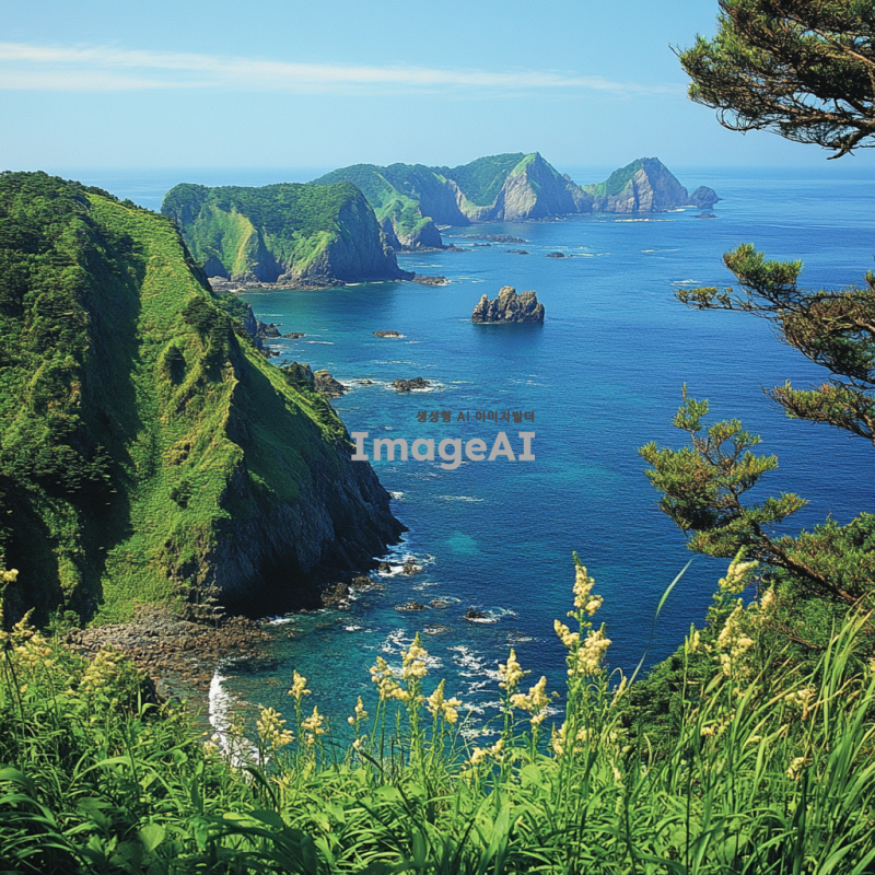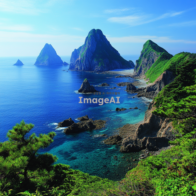 독도의 푸른 바다와 자연의 아름다움을 강조하는 장면, 맑고 푸른 하늘 아래 펼쳐진 독도의 전경, 바다와 어우러진 울창한 초목과 바위들이 조화롭게 어우러진 모습, 바람에 흔들리는 풀과 나무들, 맑은 물결이 부서지는 해안선, 독특한 지형과 자연의 신비로움을 담은 풍경, 자연광이 아름답게 비추는 평화로운 분위기.
