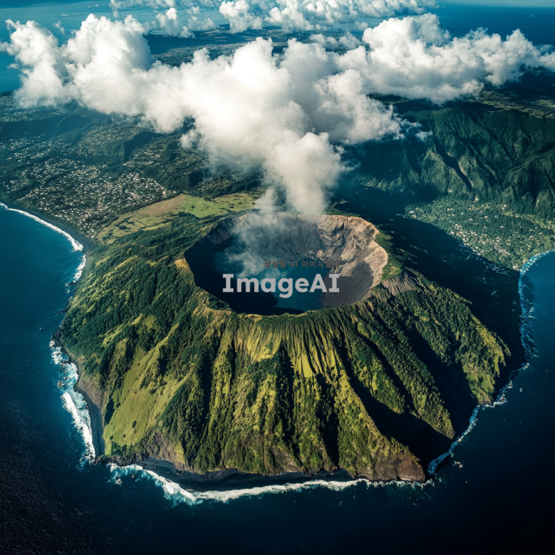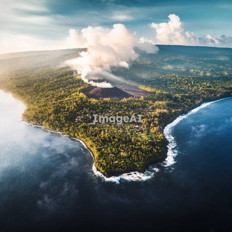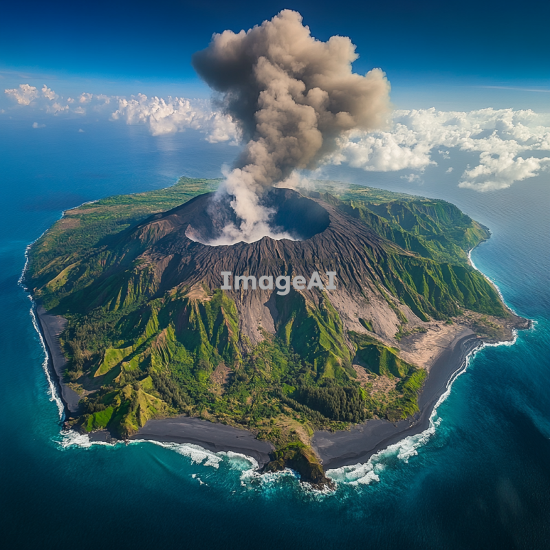 푸른 바다에 둘러싸인 화산섬, 우뚝 솟은 화산과 그 주변을 감싸고 있는 울창한 숲, 하늘을 가로지르는 흰 구름, 섬의 해안선을 따라 펼쳐진 검은 모래 해변, 섬 중앙에 위치한 화산 분화구에서 피어오르는 연기, 장엄한 자연의 아름다움과 고요함을 동시에 느낄 수 있는 풍경, 태양이 지평선 위로 떠오르는 새벽의 부드러운 빛, 바람에 흔들리는 나무와 파도 소리, 자연의 경이로움을 담은 평화로운 분위기.