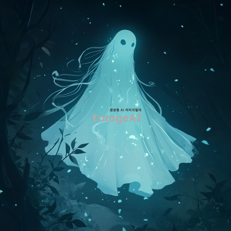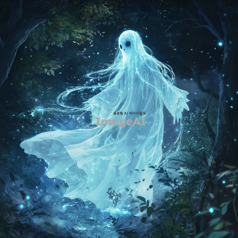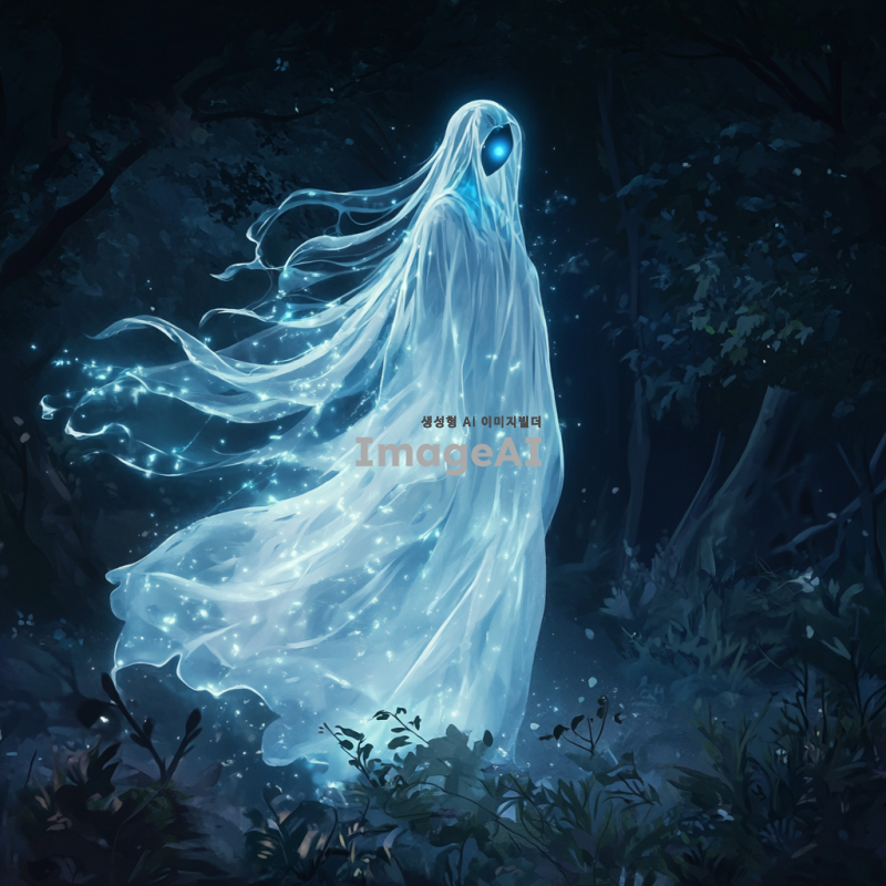 어두운 숲 속에 떠다니는 신비로운 유령 캐릭터, 반투명한 몸체와 부드럽게 흐르는 긴 옷자락, 희미하게 빛나는 푸른빛, 주변에 작은 빛의 입자들이 흩날리는 모습, 고요하고 신비로운 분위기, 달빛이 비치는 배경, 부드러운 바람에 흔들리는 나뭇잎들, 유령의 눈은 깊고 고요한 느낌, 한국 전통 의상을 연상시키는 디자인 요소 포함.
