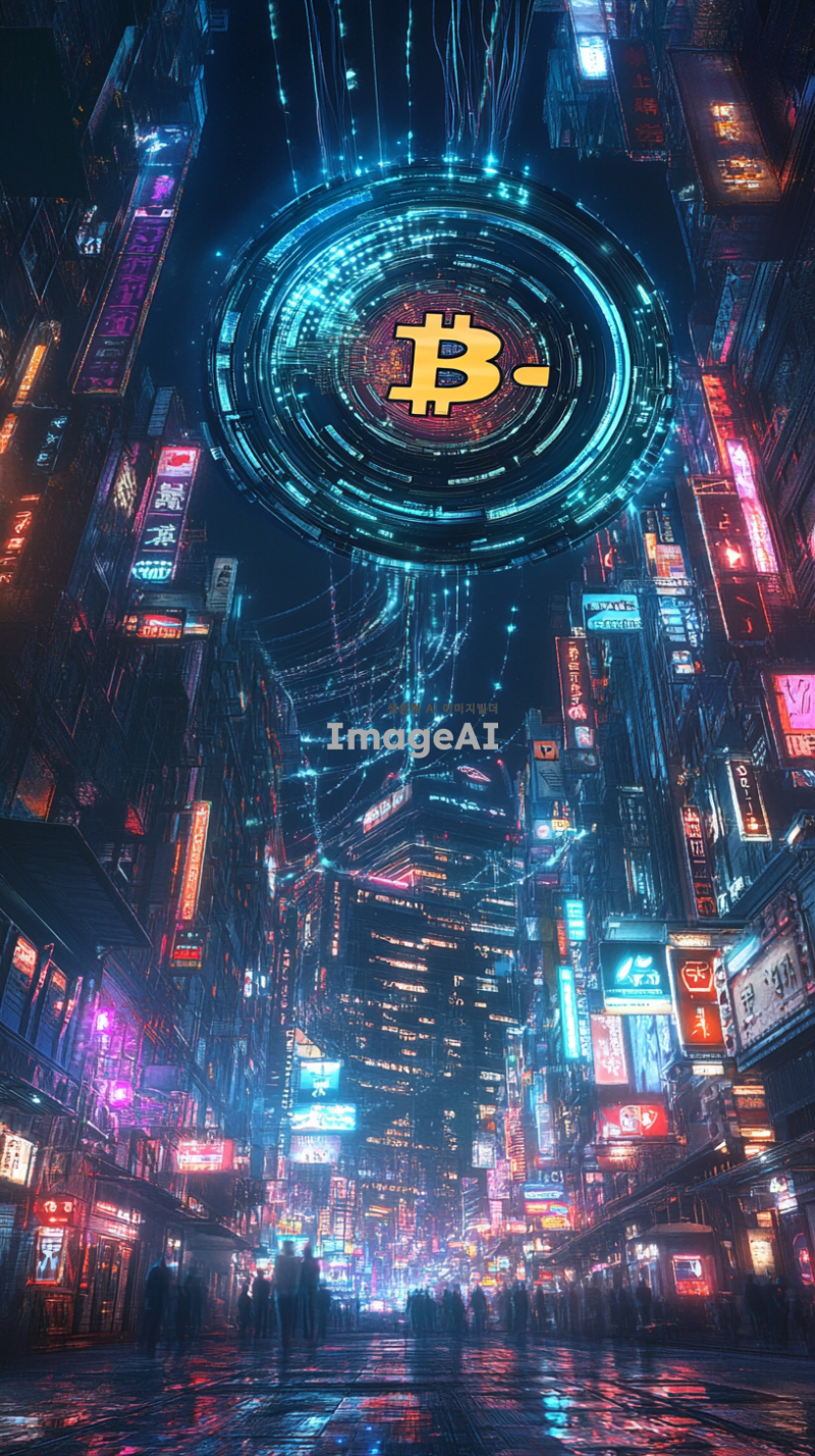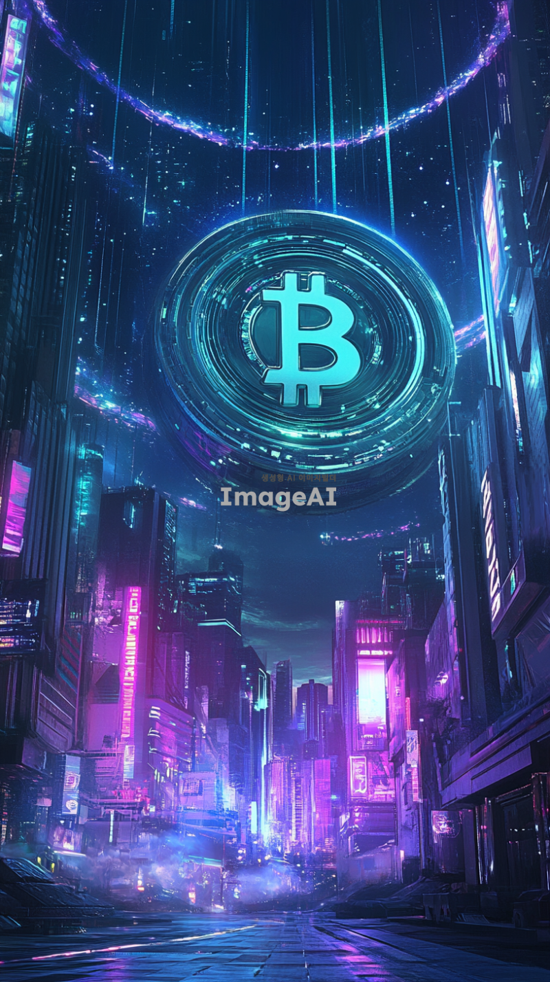 도지코인 로고를 중심으로, 미래 도시의 배경에서 반짝이는 금속 느낌의 거대한 동전이 떠오르는 장면. 동전 주변으로는 디지털 화폐의 흐름을 상징하는 빛나는 선들이 움직이고 있으며, 하늘에는 북극광 같은 화려한 색채의 빛이 퍼져 있다. 도시의 건물들은 첨단 기술을 암시하는 디자인으로, 네온사인과 홀로그램 광고가 곳곳에 보인다.