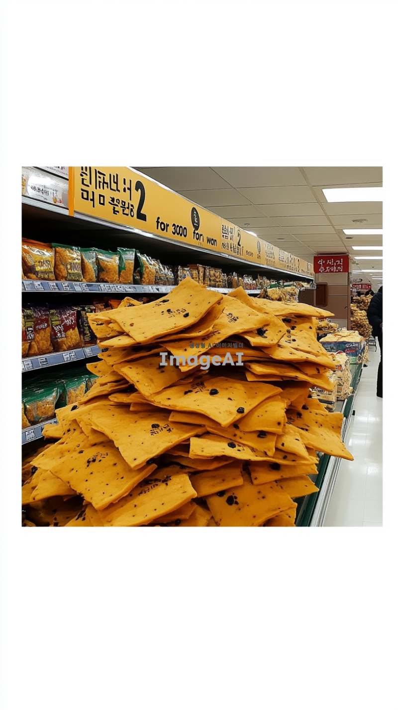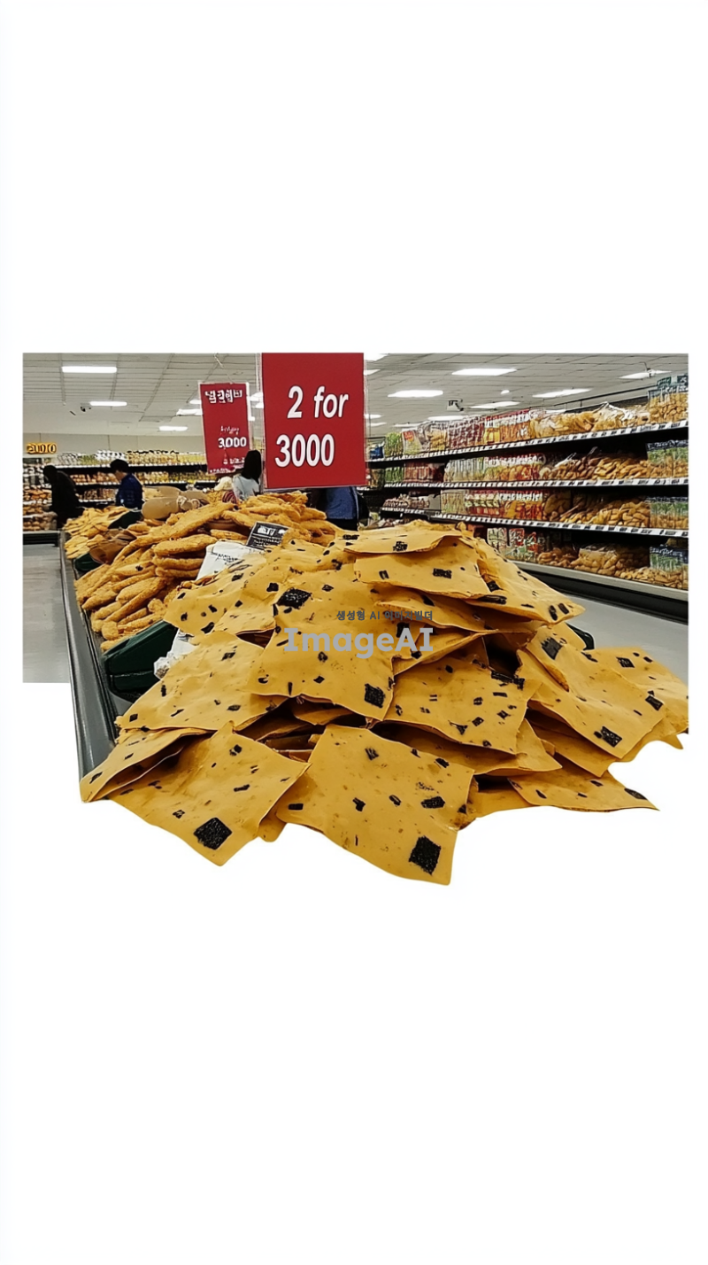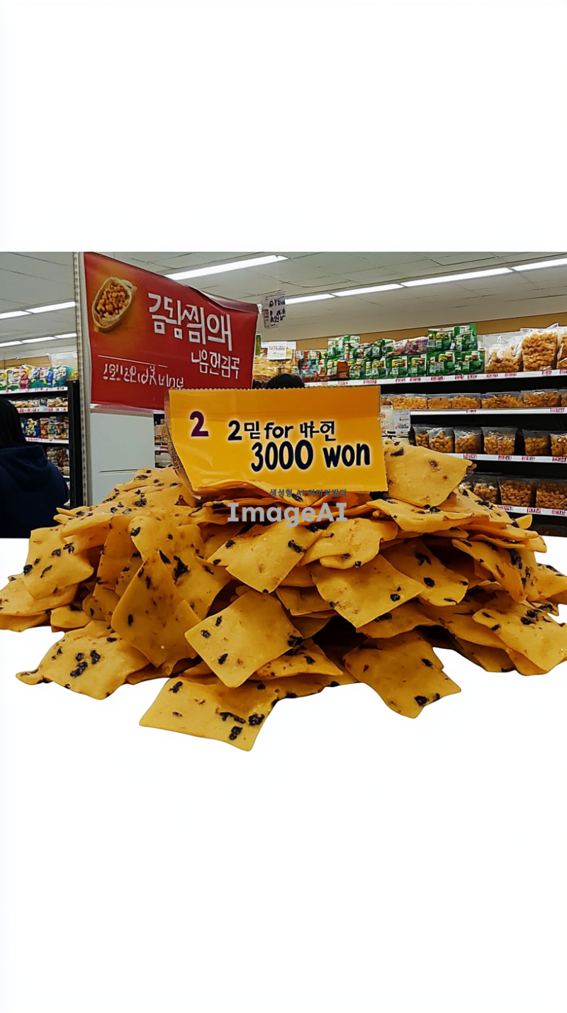 밝고 화사한 슈퍼마켓 내부, 할인 행사 배너가 걸려 있는 모습, 두부과자 패키지가 선반에 진열되어 있는 장면, 두부과자 패키지에 "2개에 3000원"이라는 문구가 선명하게 보이도록 강조, 고객들이 두부과자를 살펴보는 장면, 따뜻하고 친근한 분위기.