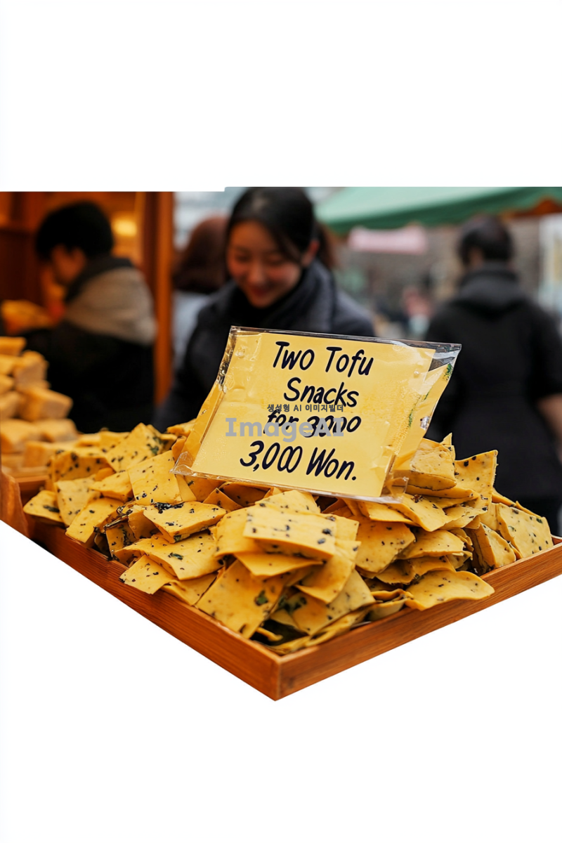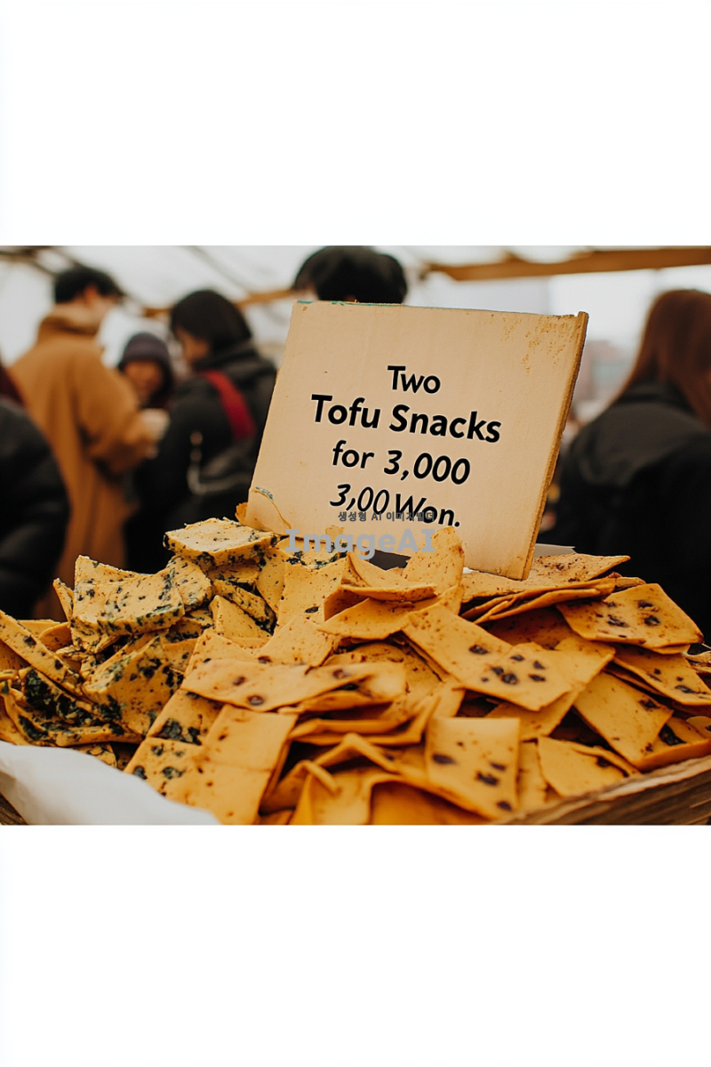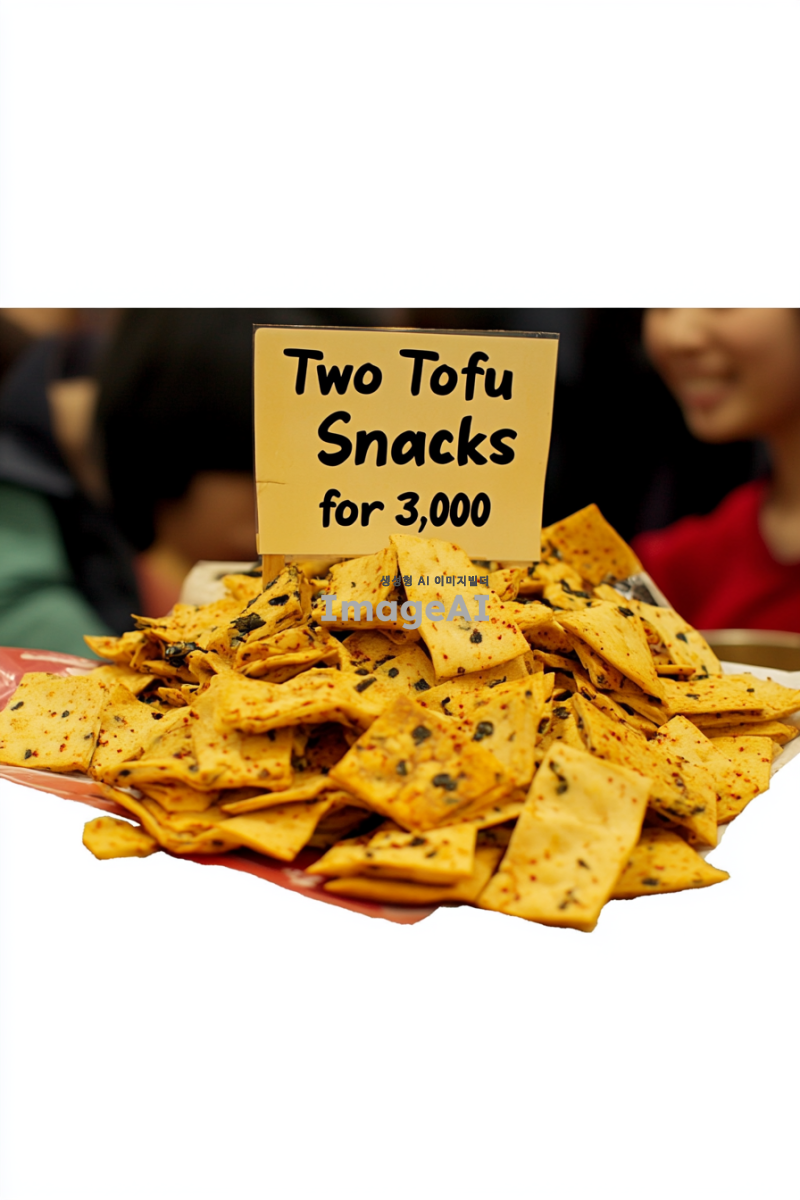 한국 전통 시장의 두부과자 판매 부스, 두부과자 2개 3000원 할인 행사 중. 부스 주변에 사람들이 북적이고, 다양한 두부과자가 진열되어 있는 모습. 판매자는 친절한 미소를 짓고 있으며, 두부과자의 고소한 냄새가 풍기는 듯한 분위기. 행사 광고판에 "두부과자 2개 3000원"이라고 적혀 있음. 한국의 전통적인 시장 풍경과 함께 따뜻하고 활기찬 느낌.
