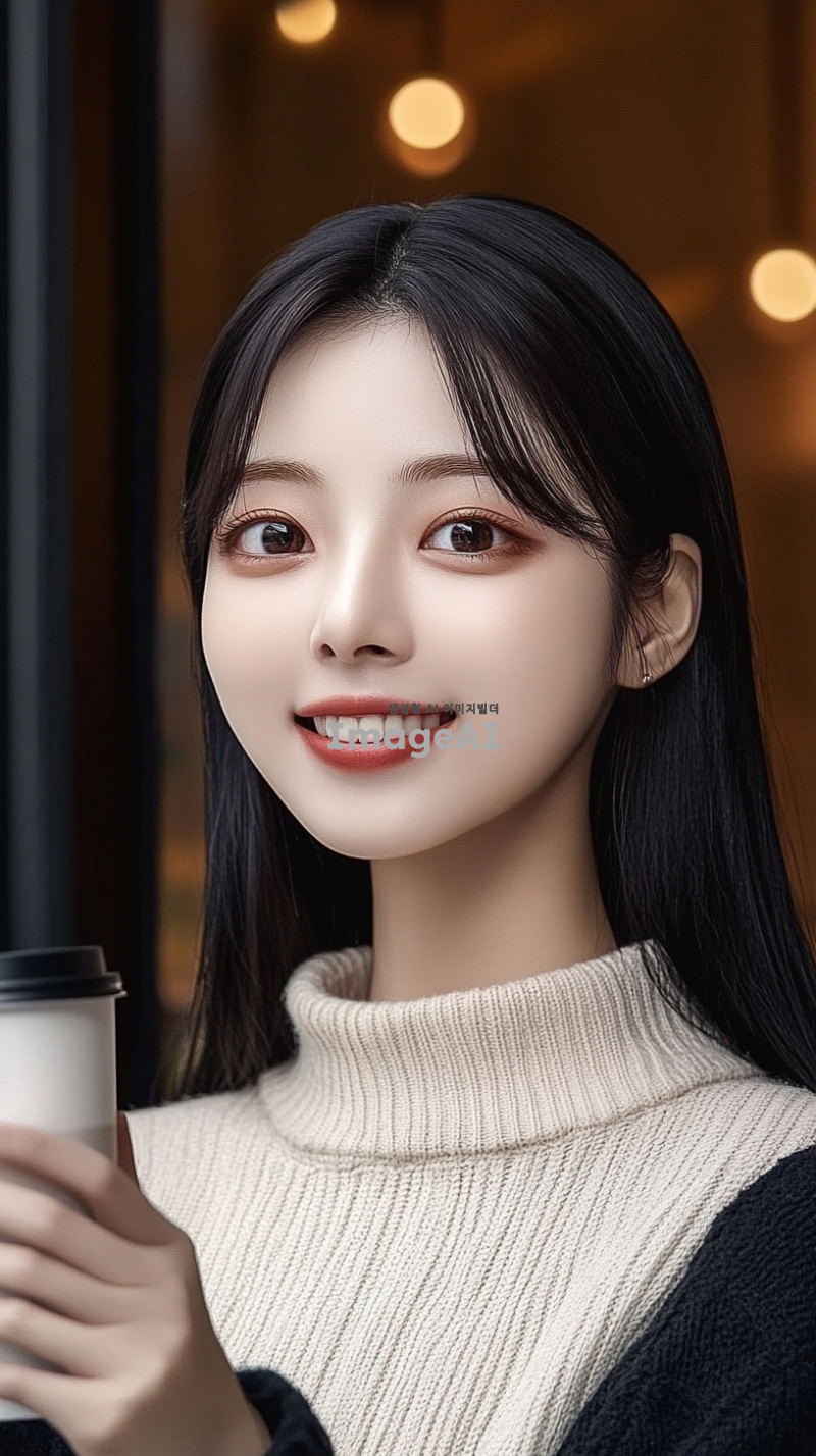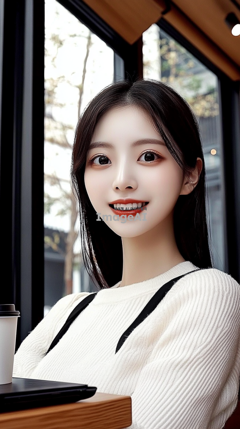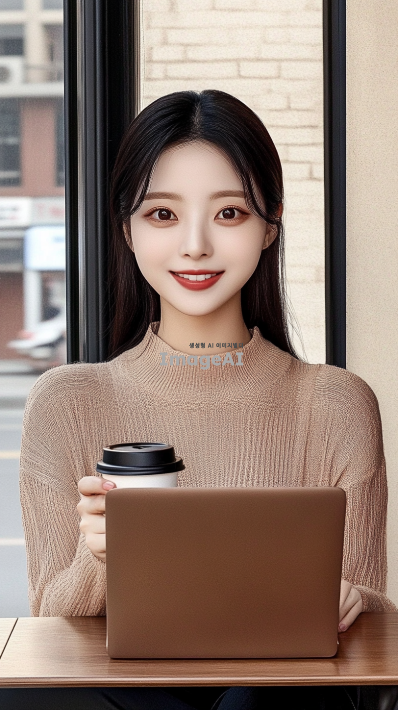 카페 내부에서 커피를 마시며 셀카를 찍는 한국인 여성, 따뜻한 조명과 아늑한 분위기, 테이블 위에는 커피잔과 노트북, 창밖으로 보이는 거리 풍경, 캐주얼한 옷차림, 자연스럽고 행복한 미소, 현대적이고 세련된 인테리어, 부드러운 색감, 포커스는 인물에 맞춰져 있음.