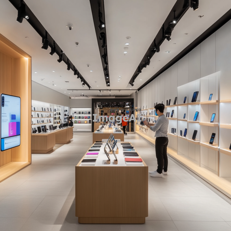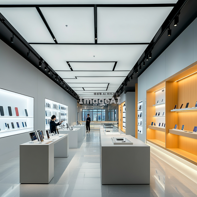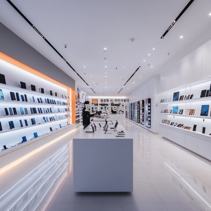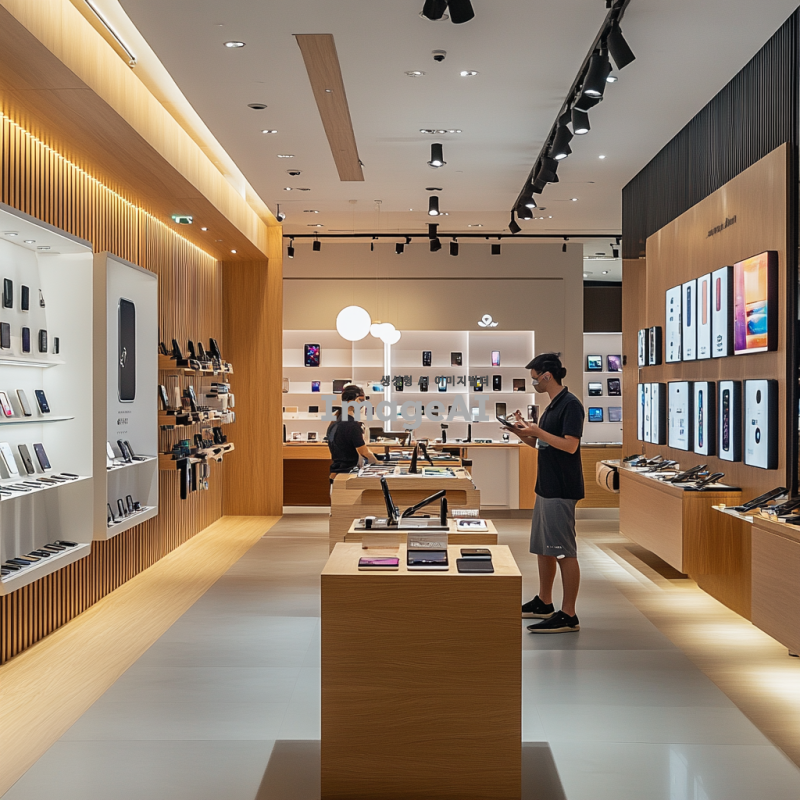 현대적이고 세련된 핸드폰 가게 내부, 밝은 조명 아래 다양한 최신 스마트폰이 진열된 모습, 깔끔하고 미니멀한 디자인의 매장, 고객들이 스마트폰을 직접 체험해볼 수 있는 공간, 친절한 직원이 고객에게 제품을 설명하는 장면, 스마트폰 액세서리와 충전기 등이 정돈되어 있는 진열대, 편안한 쇼핑 환경을 강조하는 분위기.