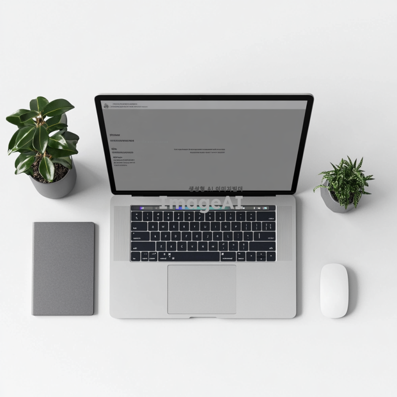 하얀색 배경 위에 업무용 노트북이 중앙에 배치되어 있고, 옆에는 모니터와 키보드, 마우스가 정돈된 상태로 놓여 있는 모습. 노트북 화면에는 교육 강의나 자격증 관련 자료가 간단하게 표시되어 있으며, 전체적으로 깔끔하고 심플한 구성이 돋보이는 이미지. 업무용 교육 자료와 PPT에 적합한 전문적이고 정돈된 분위기를 연출.