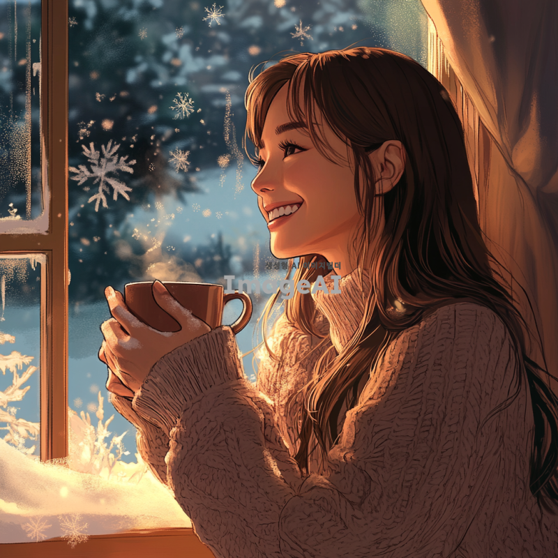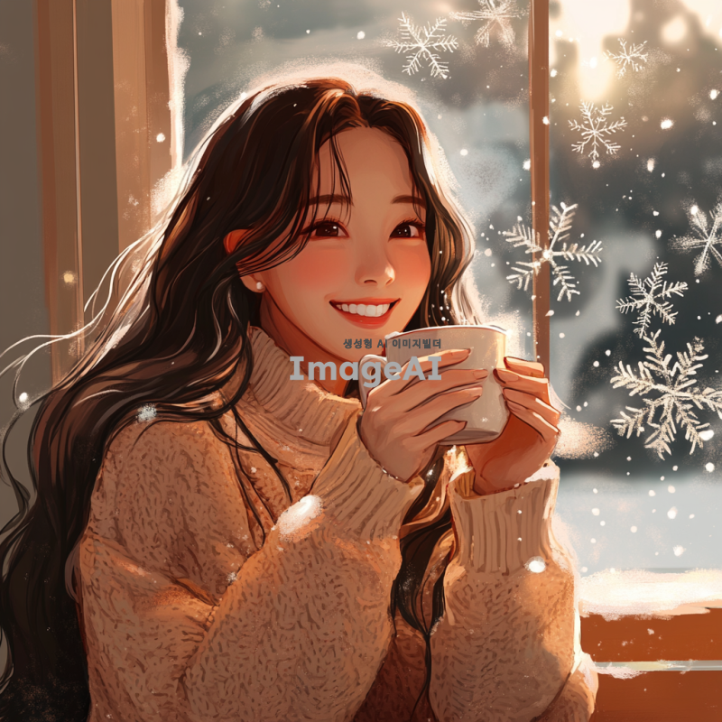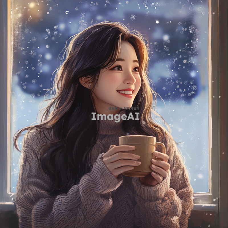 눈 오는 밤, 창가에 앉아 있는 30대 한국 여성, 따뜻한 코코아를 손에 들고 행복하게 미소 짓고 있음, 창 밖으로 보이는 눈 내리는 풍경, 따뜻하고 아늑한 실내 분위기, 부드러운 조명, 여성의 긴 머리는 자연스럽게 흘러내림, 편안한 니트 스웨터를 입고 있음, 감성적이고 따뜻한 색감의 일러스트, 디테일한 눈송이와 창문에 맺힌 서리가 강조된 배경