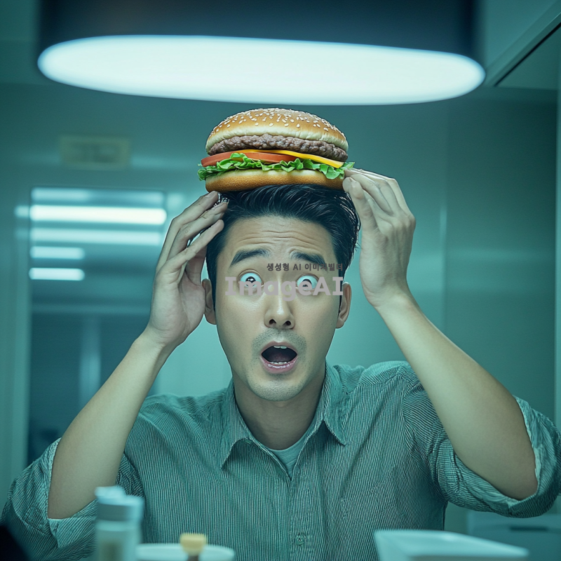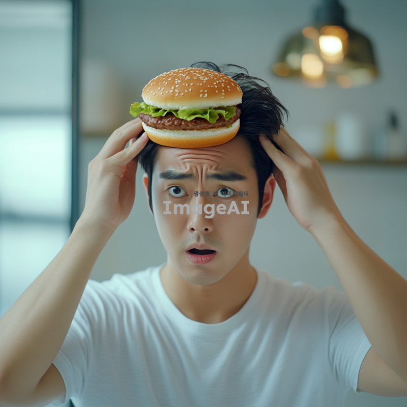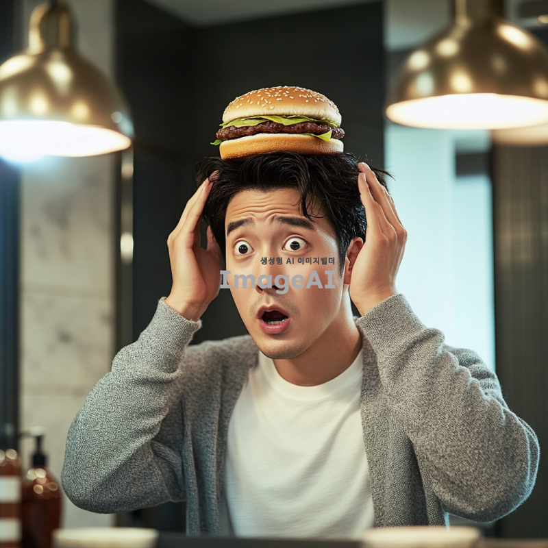 한국 남성이 거울을 보며 자신의 머리를 만지고 있는 장면, 머리 위에는 실제로 햄버거가 올려져 있는 모습, 햄버거의 디테일이 살아있고 맛있어 보이는 모습, 남성은 놀라면서도 웃고 있는 표정, 실내 배경, 현대적인 욕실 분위기.