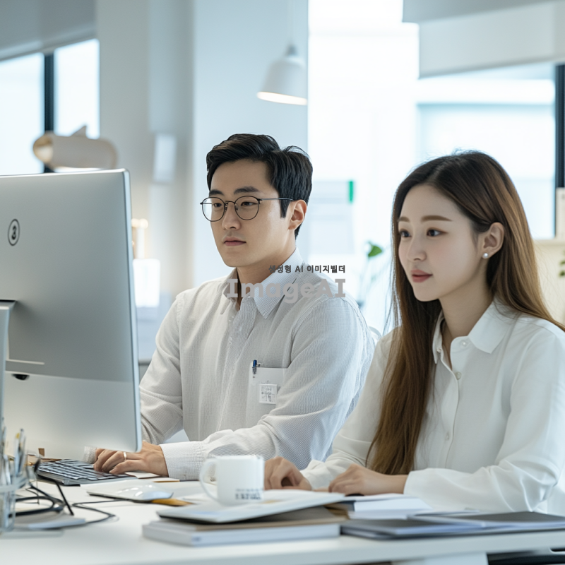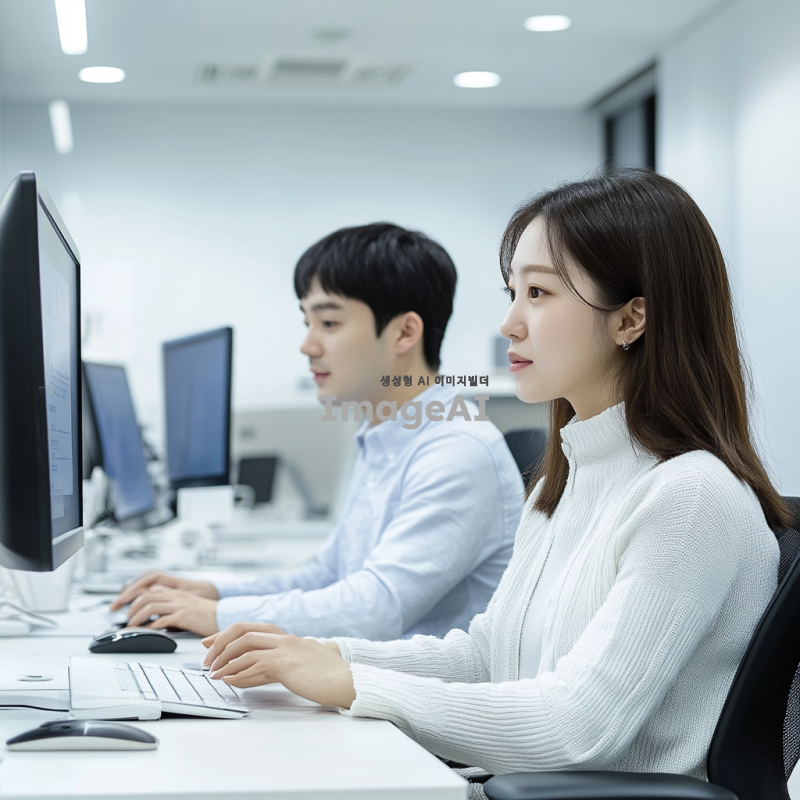 화이트톤의 깔끔한 사무실에서 한국인 직장인 남녀가 각각 앉아 컴퓨터로 강의를 듣고 있는 장면. 컴퓨터 모니터, 마우스, 키보드가 보이며, 책상은 깔끔하게 정돈되어 있음. 주변에는 최소한의 물품만 배치되어 있어 심플하고 정돈된 느낌을 줌. 사진을 통해 직장인, 강의, 자격증의 키워드가 떠오를 수 있도록 구성. 업무용 교육자료와 PPT 자료에 적합한 이미지.