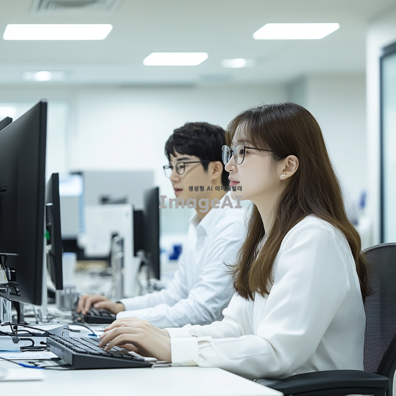 1. 직장인이 여자 한명과 남자한명이 각각 앉아서 컴퓨터로 강의를 듣고 있는사진, 컴퓨터 모니터, 마우스, 키보드가 보이면서 깔끔하게 정돈된 사진