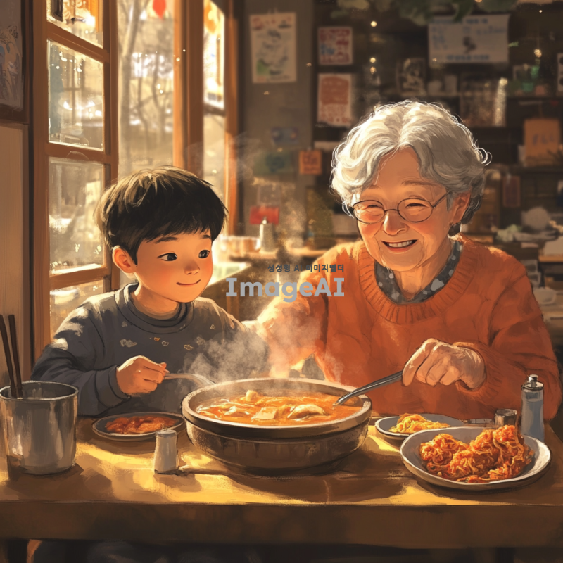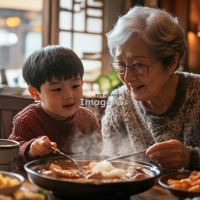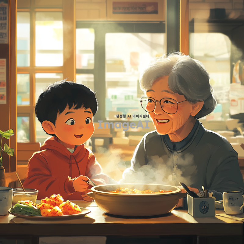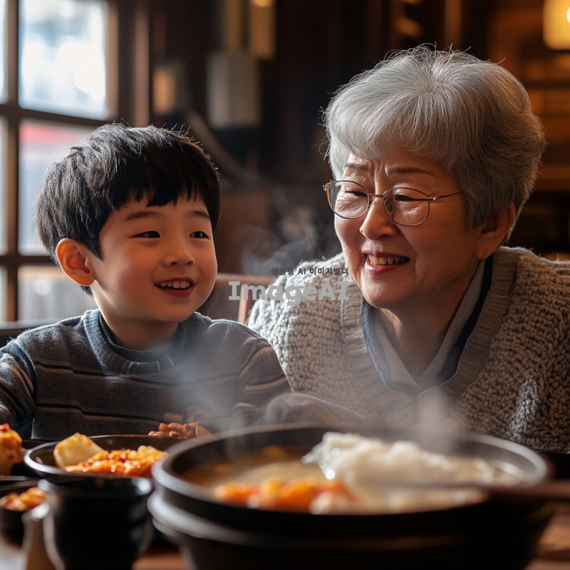 따뜻한 식당에서 할머니와 손자가 함께 해장국을 먹고 있는 장면. 할머니는 짧은 회색 머리를 하고 있으며, 안경을 쓰고 친근한 미소를 짓고 있다. 손자는 초등학생 정도의 나이로, 짧은 검은 머리를 하고 있으며, 밝고 호기심 어린 표정을 짓고 있다. 테이블 위에는 김치와 깍두기 같은 반찬들이 놓여 있고, 해장국에서 김이 모락모락 피어오르고 있다. 식당 내부는 아늑하고 전통적인 한국의 분위기를 풍기며, 창문으로는 부드러운 햇살이 들어오고 있다.