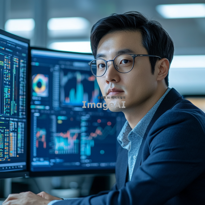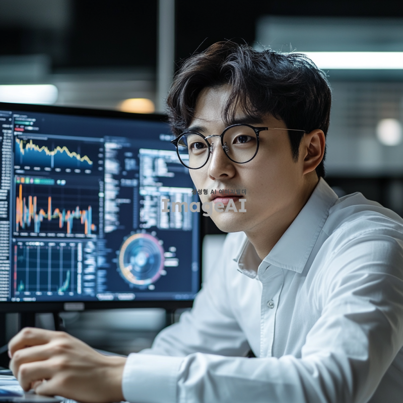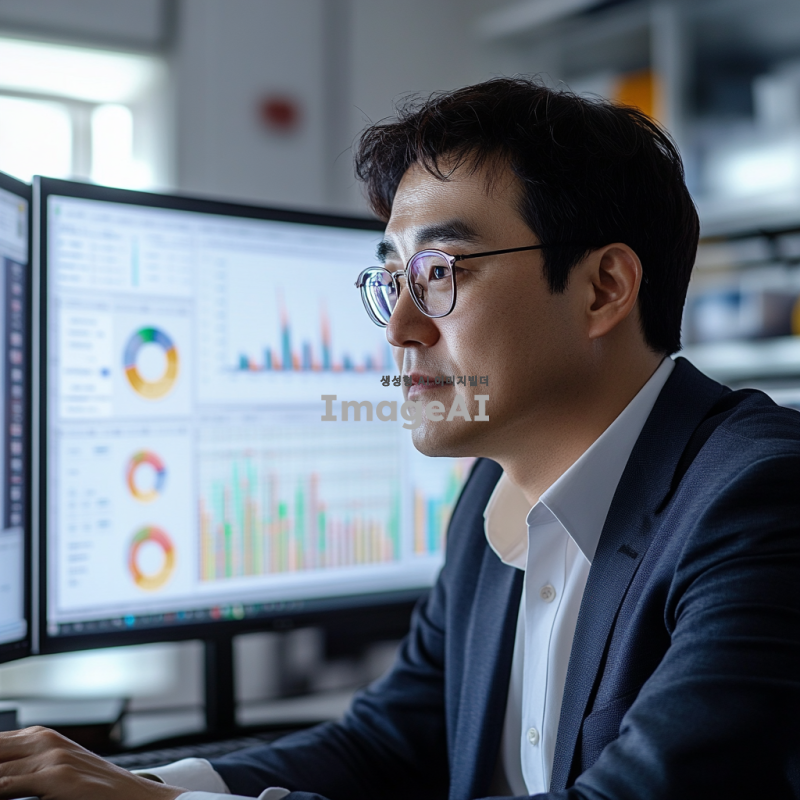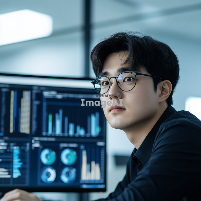 안경을 쓰고 단정한 복장을 한 데이터과학자 한국인 남성이 데이터 분석을 위해 컴퓨터 화면 앞에 앉아 있는 모습, 주변에 그래프와 데이터 시각화가 모니터에 표시되어 있으며, 노트북과 여러 가지 데이터 분석 도구들이 책상 위에 깔끔하게 정돈되어 있는 사진. 컴퓨터 모니터를 보며 강의를 열심히 듣고 있는 모습, 혁신적인 분위기, 전문성과 열정을 나타내는 표정. 화이트톤의 깔끔하고 심플하며 잘 정돈된 회사 사무실 배경, 강의, 자격증, 직장인이 떠오르는 이미지.