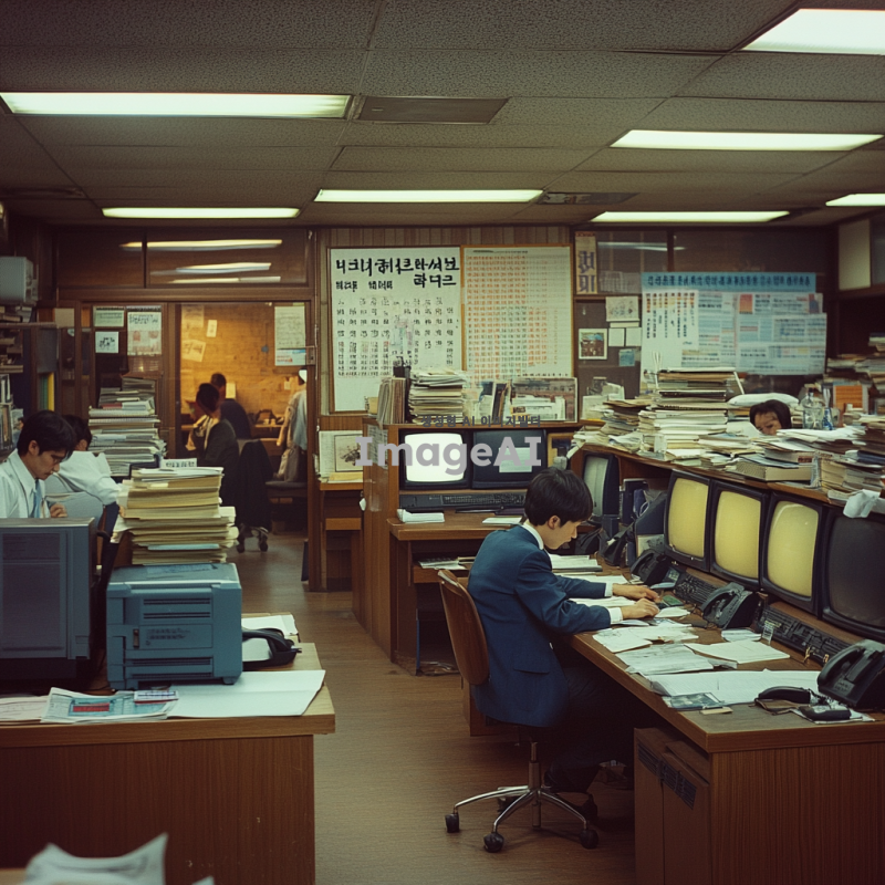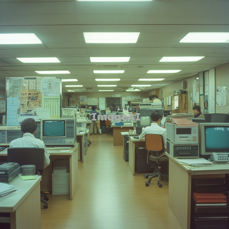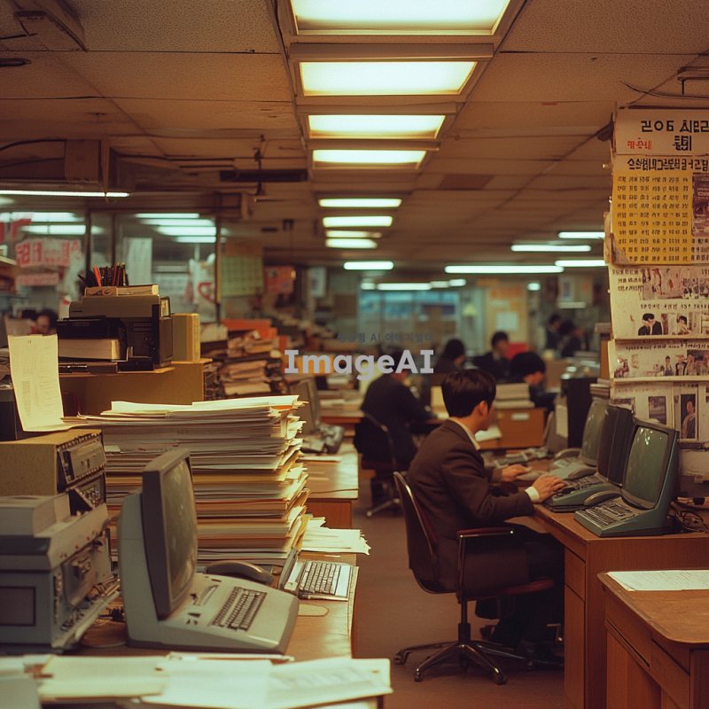1980년대 한국의 사무실 내부, 복고풍 인테리어, 오래된 책상과 의자, 아날로그 전화기, 두꺼운 CRT 모니터, 종이 서류가 쌓인 책상, 벽에는 복고풍 포스터와 달력, 형광등 조명, 사람들이 일하는 모습, 당시 유행하던 패션 스타일, 따뜻한 색감의 조명과 분위기, 바쁜 업무 환경.